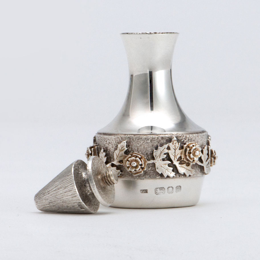 A 20th century silver Perfume Bottle, London 1978, by Mappin and Webb, applied with a band of rose decoration and with a matted screw-on stopper. Light gilding to the band of decoration. Condition: \n