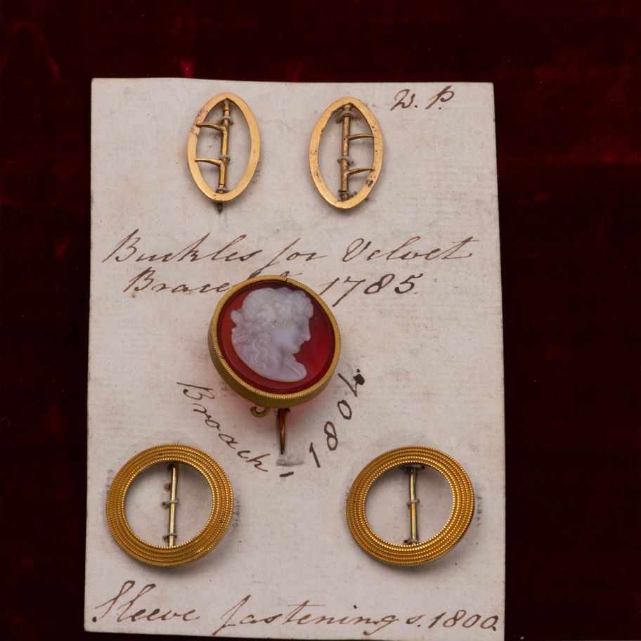 A Collection of 18th and early 19th century Costume Jewellery mounted on card with dates and owners comrpising: \nA gilt-metal snake Clasp with lion's head terminals, the reverse of the card inscribed 'Belt Clasp 1802. A.M. Portman.' \nA gilt-metal Tiara formed as five graduated leaves on a band pierced with Greek key decoration, the reverse inscribed 'Tiara 1805 Wyndham Portman.' \nA Hair Comb in gilt-metal formed as a feather-like crescent applied with a glass cameo, the card inscribed 'Crescent for the Hair 1804 W.P.' \nA gilt-metal Clasp formed as adjoining shells with lattice piercing and bead decoration, the card inscribed 'Lock & Belt Clasp 1800'. The card mount is a visiting card printed with the names 'Mrs. F. Pleydell Bouverie Miss E. Pleydell Bouverie.' \nTwo pairs of gilt-metal fasteners and a glass cameo Brooch mounted in gilt-metal, the card mount inscribed 'W.P. Buckles for Velvet Bracelets 1785, Brooch 1804, Sleeve fastenings 1800.' The reverse of the card with script 'Miss Hawes requests the favor of Mrs. & Miss Portmans company for Cards Thursday Jany. 2nd. Rollestone St. Decbr. 26th.' \nA pair of gilt-metal Bracelets formed as pierced panells with ring links, the card inscribed 'Bracelets 1792. W.P.' \nA short Necklace and a pair of Earrings formed from mother-of-pearl, the card inscribed 'Mrs. Doggets Necklace & Earrings 1760.' \nWyndham Portman, the daughter of Henry William Portman of Orchard Portman and Bryanston in Dorset and his wife, Anne, daughter of William Wyndham of Dinton, was born circa 1773 and died in November 1843. Ann Mary Portman, her elder sister, was born in 1766 and died in October 1844. Henry William Portman was responsible for the development of 200 acres of land on the north side of Oxford Street in London - beginning with the construction of Portman Square in 1764. \nRollestone Street is in Salisbury, Wiltshire. Condition: \n