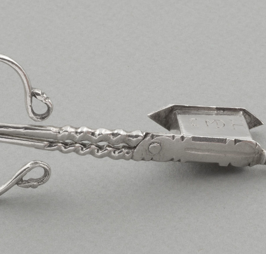 A Dutch Toy Snuffer and Tray, Leiden probably 1681, maker's mark a key (unascribed, see Voet). The snuffer's struck only with a maker's mark, the maker's mark on the tray poorly struck. Each piece engraved at a later date with initials 'CMDH'. Condition: \n