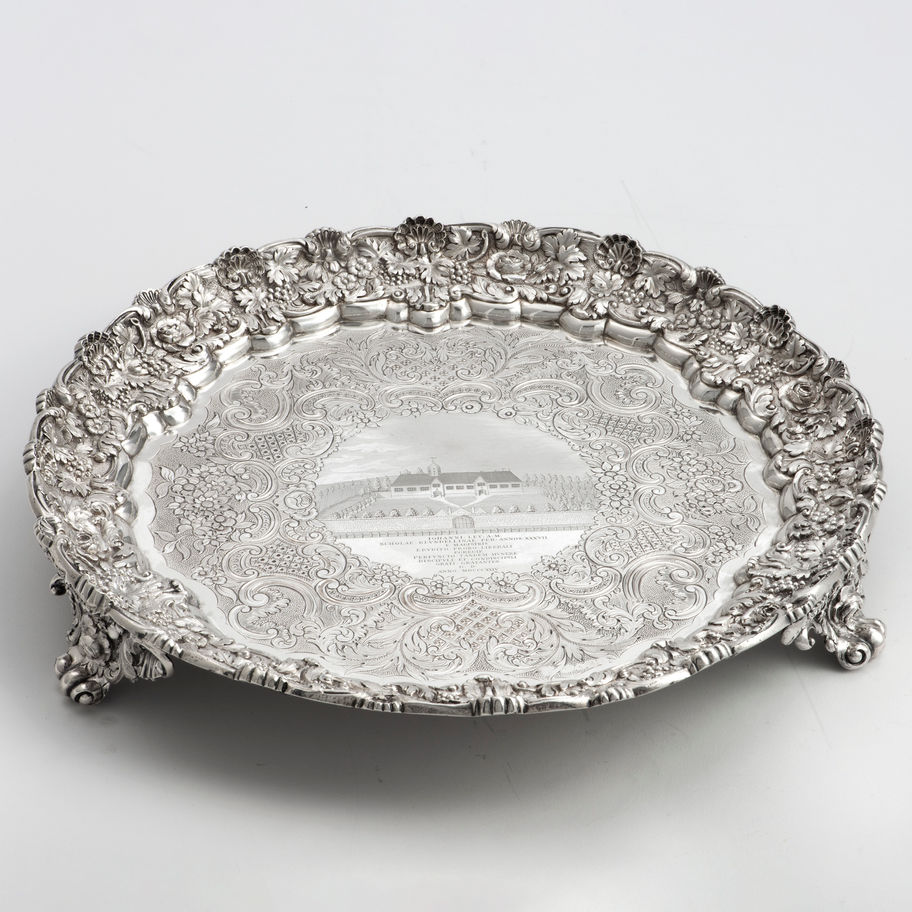 Blundell's School, Devon. \nA fine George IV Salver in the rococo revival manner, the border and feet cast and decorated with shells, flowers, vine leaves and grapes, and wheat ears, London 1823 by Cradock and Reid. The centre of the Salver is engraved with a view of the school above a presentation inscription surrounded by a wide field of flat-chased scrollwork, trellis panels, and flowers. \nThis Salver was one of three presented to John Ley Under-Master at the School on his retirement. Details of the presentation are to be found in 'The History of Tiverton in the County of Devon, Book III', published in 1845. Ley had been appointed Under-Master in 1788 and remained in that post for 36 years. He had been a pupil at Blundells and was admitted to Sidney Sussex College, Cambridge in 1779. On retiring from Blundell's School, he was presented, by many of his scholars and others, with 'Three handsome large silver salvers, (one of which was 24 inches in diameter,) weighing 293 ounces , on which was engraven the following inscription: \nJohanni Ley, A.M. Scholae Blundellinae per annos xxxvii, E. magistris Erudito, probo, liberali, egregie, perfuncto tandem munere, discipuli et condiscipuli. Grati gratantes. D.D. Anno MCCCXXIV. \nThis presentation took place on the day of the anniversary meeting of Blundell's scholars, (on the return of the procession from Church,) in the School Green, on the 27th of August 1824. He still resides in Tiverton.' Condition: \n