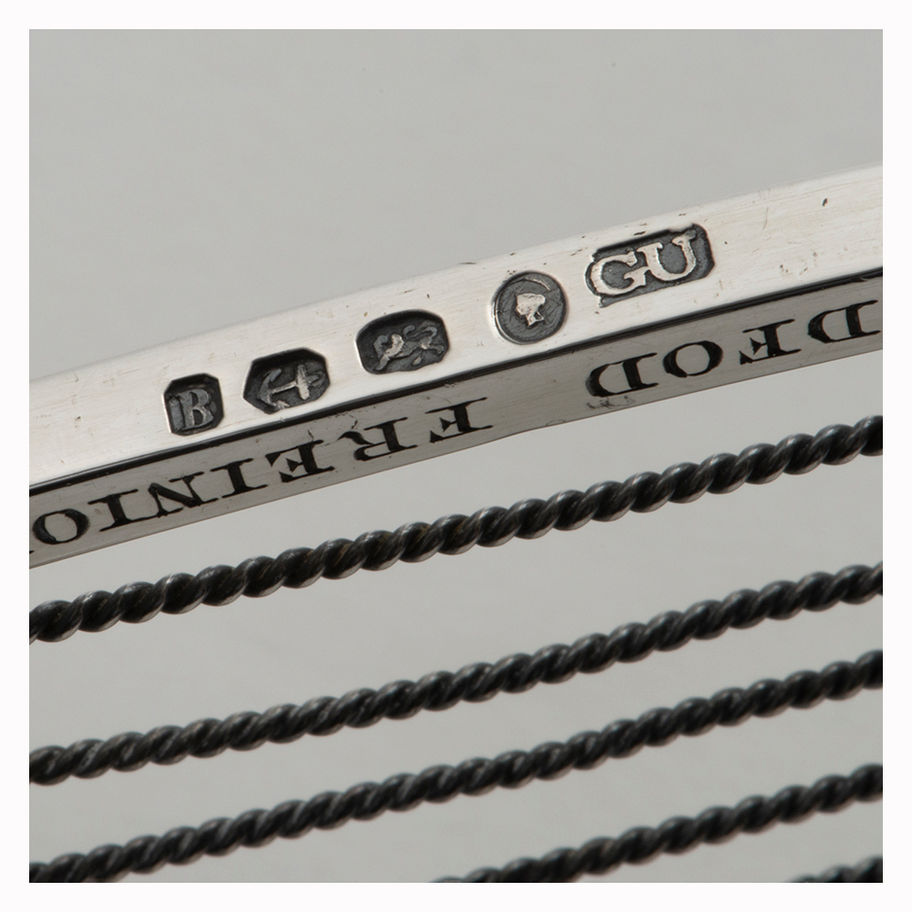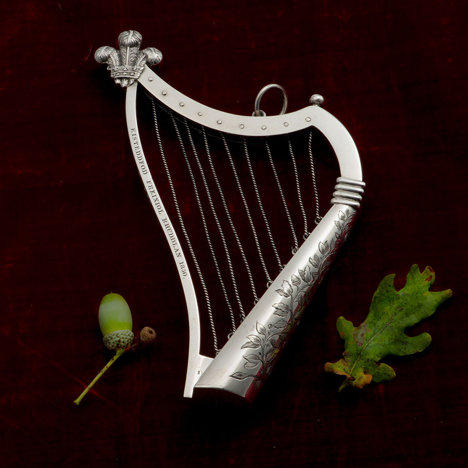 \nA fine and large silver prize Badge in the form of a Harp, by George Unite of Birmingham 1850, presented to Llewelyn Williams, the Harpist, 1822-1872. The badge is engraved with: '‘EISTEDDFOD FREINIOL RHUDDLAN 1850’; and on the reverse '‘PRESIDENT THE RIGHT HONOURABLE LORD MOSTYN’. On the outer curve of the sound box the badge is further engraved with oak sprays and acorns and is applied with the badge of the Prince of Wales at the apex.