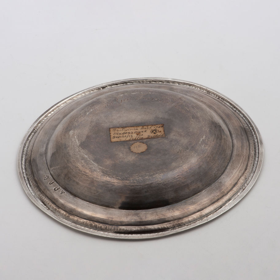 A George I Britannia standard silver Alm's Dish, London 1722, the maker's mark 'BE' with a pellet below and at least one pellet above. This mark was recorded by Grimwade on a strainer of 1718 and attributed to George Beale [Grimwade 3486]. \nThe reverse of the dish is engraved: 'Ex Dono Geo: Turvile Armr. 1724.' \nAn old paper label pasted on the underside suggests that the maker is James Beschefer but Beschefer's mark is different. \n \nGeorge Turvile, citizen and fishmonger, died in March 1735 'of a consumptive illness', apparently without leaving a will. He had inherited considerable property from his father, George Turvile, who had, in turn inherited from his uncle Richard Turvile, died 1693. He had also inherited the property of his brother, Litcott Turvile, who died in 1730 [George Turvile senior, had married Elizabeth, daughter of Giles Litcott]. On the death of George in 1735, the properties then passed to a third brother, the Rev. William Turvile, then Vicar of Claxton in Leicestershire. \n \nGeorge Turvile was involved in a court case in 1727 against Stephen Ainsworth, a linen-draper, had enticed him with false promises to lay out £4760 in the purchase of South Sea stocks. Turvile was awarded £5600 in damages. \n \nIt has not yet been possible to trace which church Turvile gave this alms dish to - a Victorian account of the church plate of St. Mary's Bromley, the ancient parish church of St. Leonard Bromley, where Turvile owned properties, does not list the dish. \n \nSilver by Beale is characterised by its simple and plain lines. This alms dish is raised from a sinlge piece of sheet silver. Condition: \n