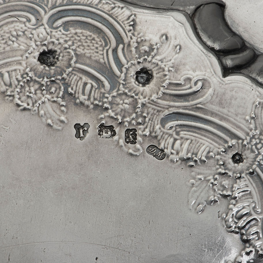 A George II silver Salver, with shell and scroll border, supported on three scrolled feet, the field with a chased border of flowers and scrolls, London 1752, by Dorothy Mills. Engraved in the centre with a contemporary coat-of-arms - gules, a cross or between four swans - possibly for Broderip of Somerset. The reverse of the salver engraved with a scratch weight '28-19'. \n \nFor a reference to Dorothy Mills, widow of Hugh Mills, see the essay on John Carter on the 'Research' tab of this website. Condition: \n