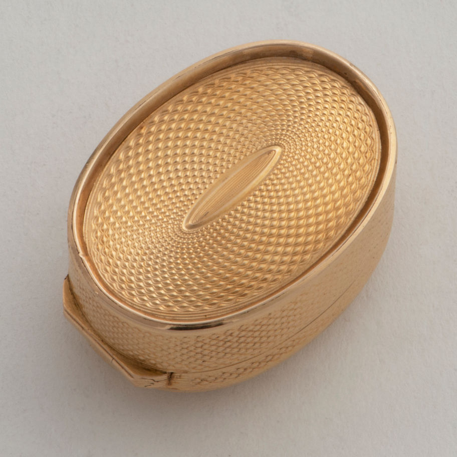 A George III engine-turned 18 carat gold Vinaigrette, London 1801 by Jacob Amedroz, the lid glazed with a panel of hair on silk below. \nGiven the quality of the pieces from his workshop, Amedroz [or Amé Droz] surely deserves further research. \n \nWorking from an address at 6, Meard's Street, Soho, he entered two marks with the Goldsmiths' Company in 1798, as a box maker. Earlier references give his profession as that of gold engraver. \n \nHe had married Susanne Marguerite Alezan at St. George's Hanover Square on the 3rd May 1777. A son and daughter were born from this marriage: Henry Frederic, born on the 9th September 1783; and Charlotte Amelia born on 7th April 1778. Charlotte married Peter Isaac Pictet of St. Mary Aldermanbury on the 10th June 1796. \n \nJacob was buried at St. Anne Soho in April 1806. His widow, Marguerite, then living in Kensington, died in 1808. \n \nHe appears to have been of French Swiss origin. According to the Revue des publications historiques de las Suisse Romande [1922], a Lt. Colonel Jacob Amedroz, Swiss born, had joined the French army in 1729. This Jacob Amidroz left a will in which, amongst numerous legacies, he left a small sum to a Hy. Frederic Amedroz of London [Nat. Arch. Prob 11/1537/241, proved in 1812]. His brother, 'Joshua Ame Droz' had died in Switzerland in February 1793, having written his will whilst living in Meard's street in Soho [Nat. Arch. Prob 11/1228/130]. The will does not, however, mention Jacob Amedroz, the goldsmith - although Justin Vulliamy, watchmaker of Pall Mall, is made an executor in a codicil and it is interesting to note that a watch by Gray and Vulliamy [British Museum collection 1958,1201.293] has a replacement bezel made by Amedroz. \n \nA 'Mr Amedroz' is listed as one of those who subscribed to a fund at the Helvetic Chapel in Moore Street, Soho, directed to alleviating the suffering of the Swiss in the Little Cantons as a consequence of the 'Last Campaign in Switzerland'. [See 'The Sun' April 15th, 1800]. And Peter Isaac Pictet, who had married Jacob Amedroz's daughter, Charlotte, was Swiss in origin [ Will of Catherine Pictet, Spinster of Geneva, Nat Arch. Prob11/1261/109]. \n \nAmedroz's apprentices include Peter Faddy [4th January 1776] and Charles Sharp [November 1789]. \n \n Condition: \n