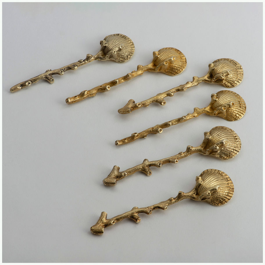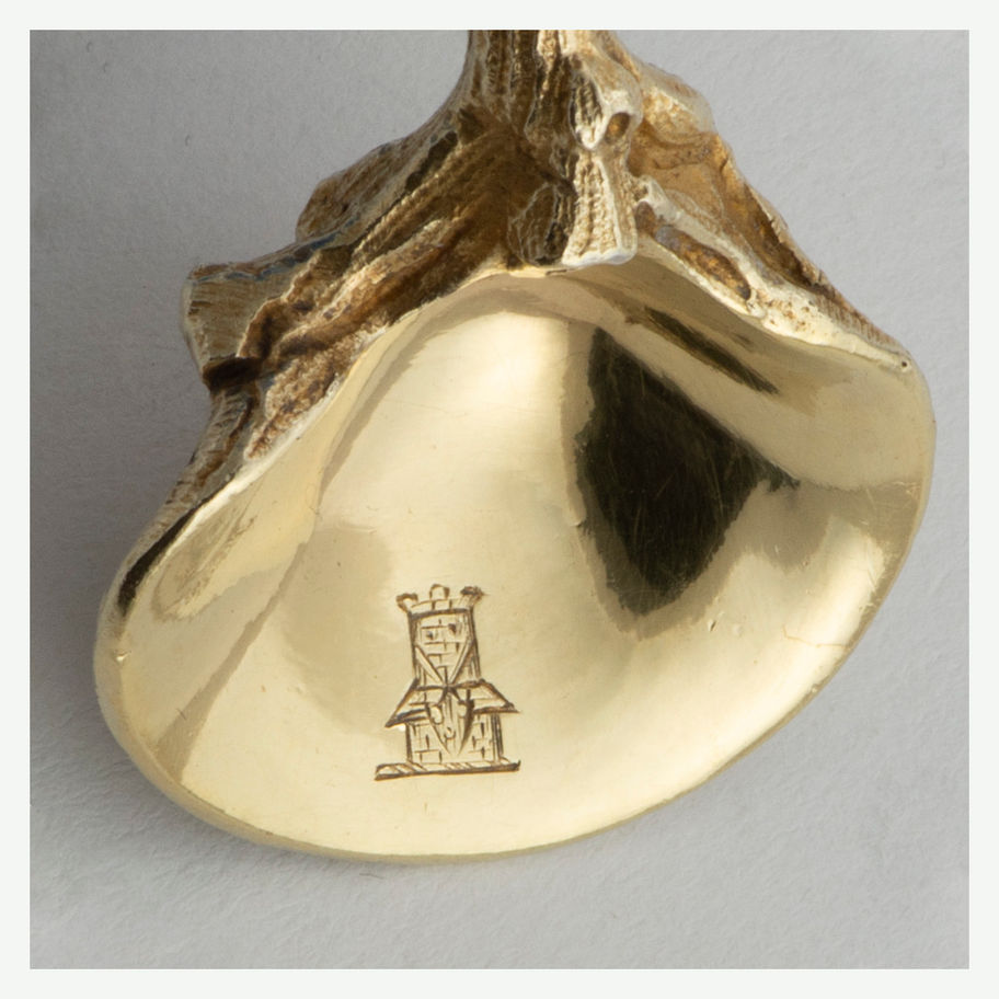 A fine set of six silver-gilt Salt Spoons, London 1813, by Robert Garrard, the stems formed as branches of coral and the bowls as scallop shells. Each bowl is engraved with a crest for Higginson of Saltmarshe Castle, Hereford.William Higginson died in 1812 and his estate passed to his great nephew, Edmund Barneby, who subsequently assumed the surname of Higginson. \nThese spoons are copies of a set of unmarked spoons by Paul de Lamerie which were made to accompany shell and mermaid salts of 1739. Ths set of four salts and spoons, together with a further pair of salts and spoons by Paul Storr, London 1819, are now in the Sterling and Francine Clark Art Institute [see 'English, Irish, & Scottish Silver at the Sterling and Francine Clark Art Institute', Beth Carver Weiss, published 1997, pp. 230-1 and p. 235.] Dimensions: \n