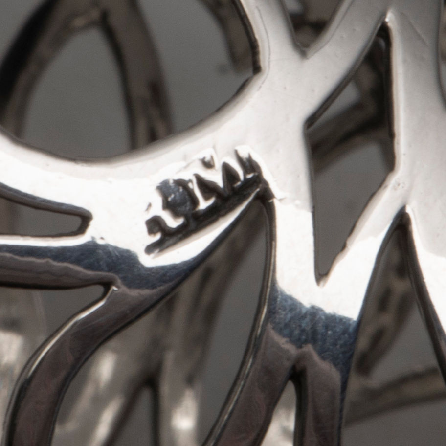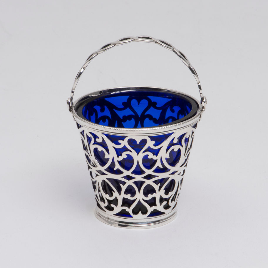 A George III pierced silver Cream Pail, London 1767, by Richard Meach [probably]. The handle is unmarked but original and there is an additional maker's mark on the side of the pail. Engraved underneath with contemporary owner's initials 'B' over 'D.F'. With blue glass [later] liner. Condition: \n