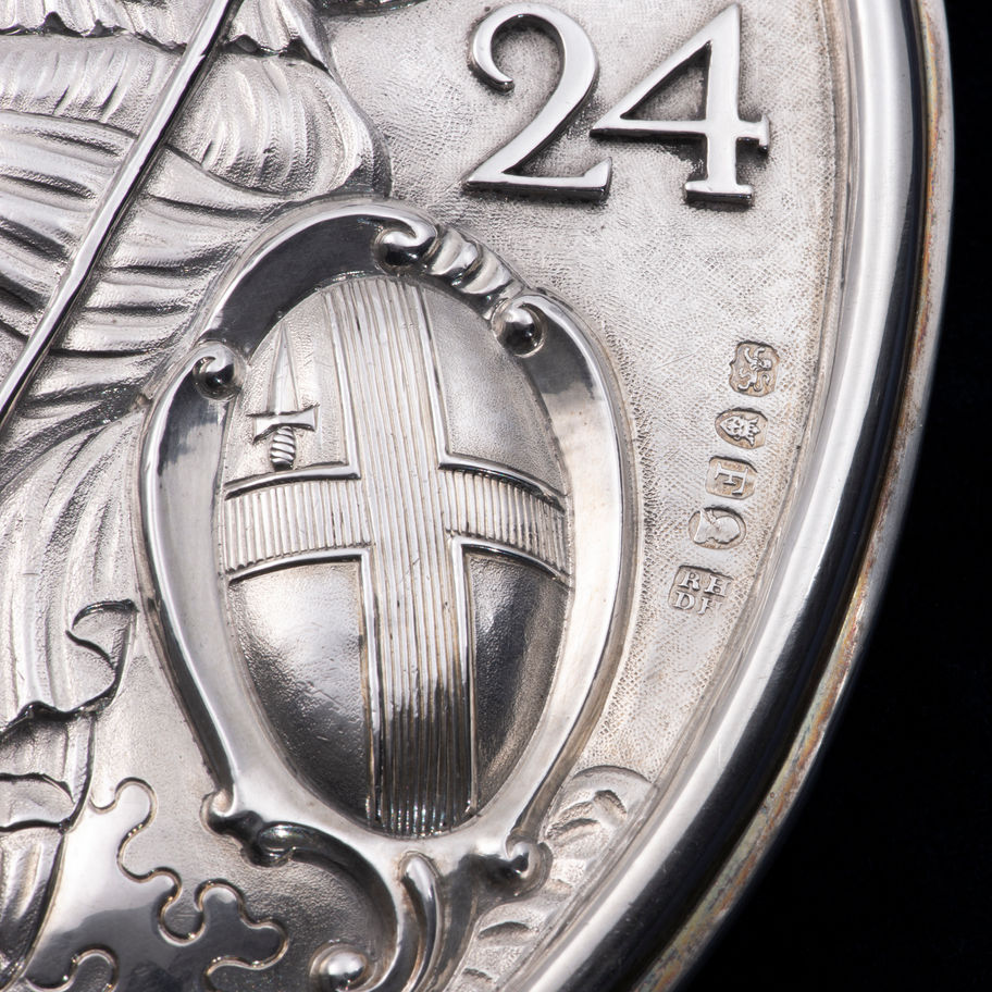 \nA George III silver Fireman's Arm Badge, London 1801, by Robert and David Hennell. The oval image is chased with a figure of Britannia, holding a spear in her left hand and a harp in her right. To the left of Britannia is a shield bearing the arms of the City of London. The badge bears number '24'.