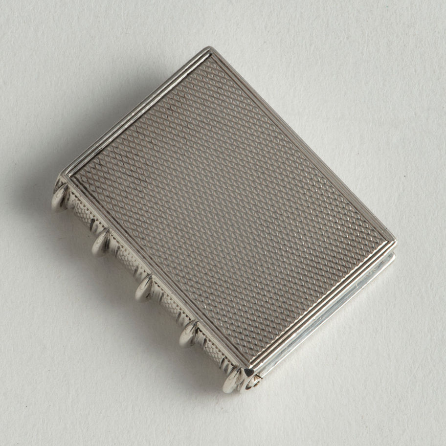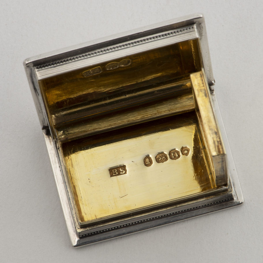 A George IV silver Book-shaped silver Vinaigrette, London 1828, with floral scroll interior grille. The maker's mark, 'B.'S' with a pellet between is similar to that illustrated by Grimwade for Benjamin Smith II but which lacks the pellet between the B and S. The mark on this vinaigrette is more likely, however, to be that of Benjamin Stephens, a gold worker of 7, Searle Place, Carey Street. \nThe whole of the interior silver-gilt. Condition: \n