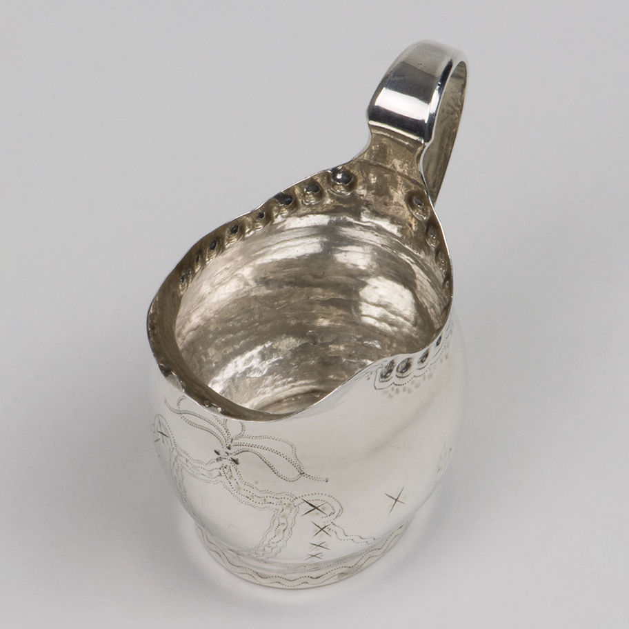 An unusual George IV Toy silver Cream Jug, Exeter, 1825, by Francis Parsons. The marks are positioned under the lip of the jug and have clearly slipped when being struck. Condition: \n