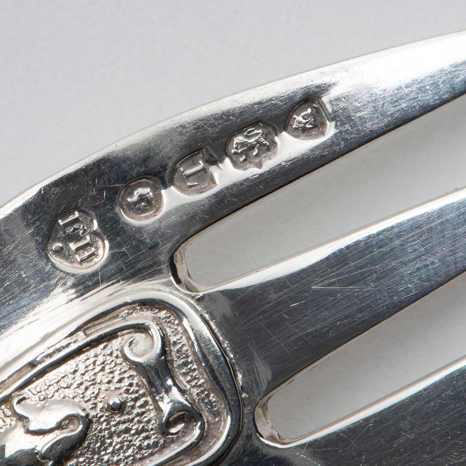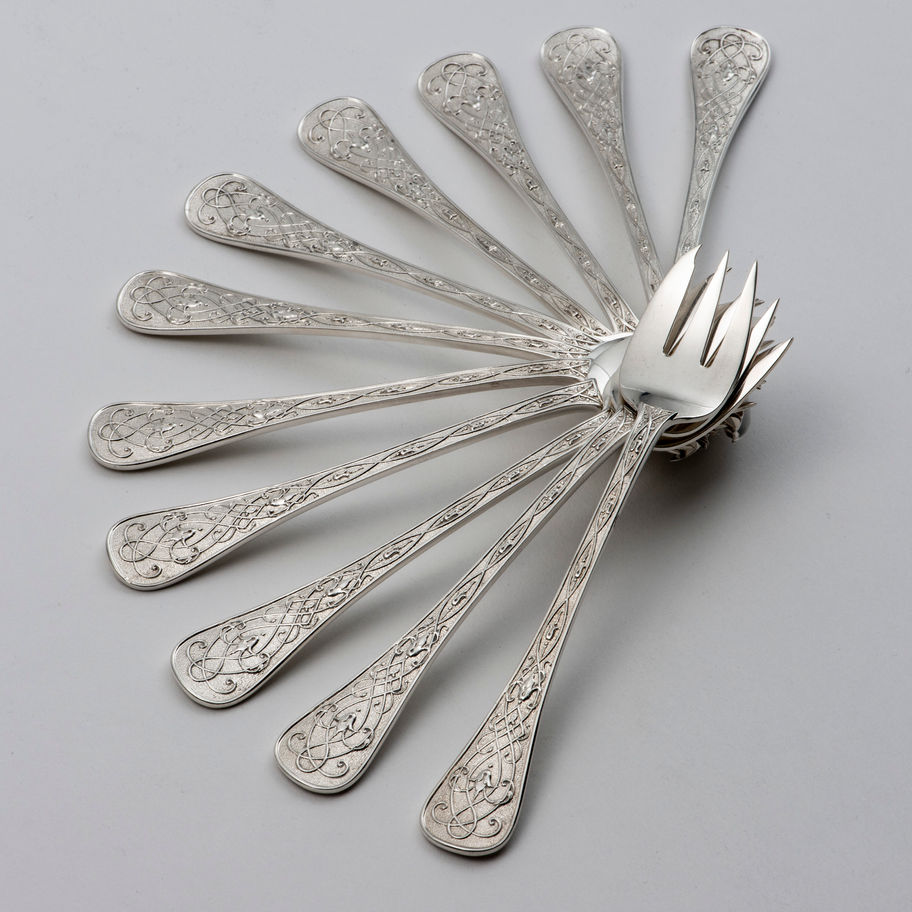 A set of eleven Elizabethan pattern silver Oyster Forks, London 1886, by Francis Higgins. Engraved with the owner's initials. Condition: \n