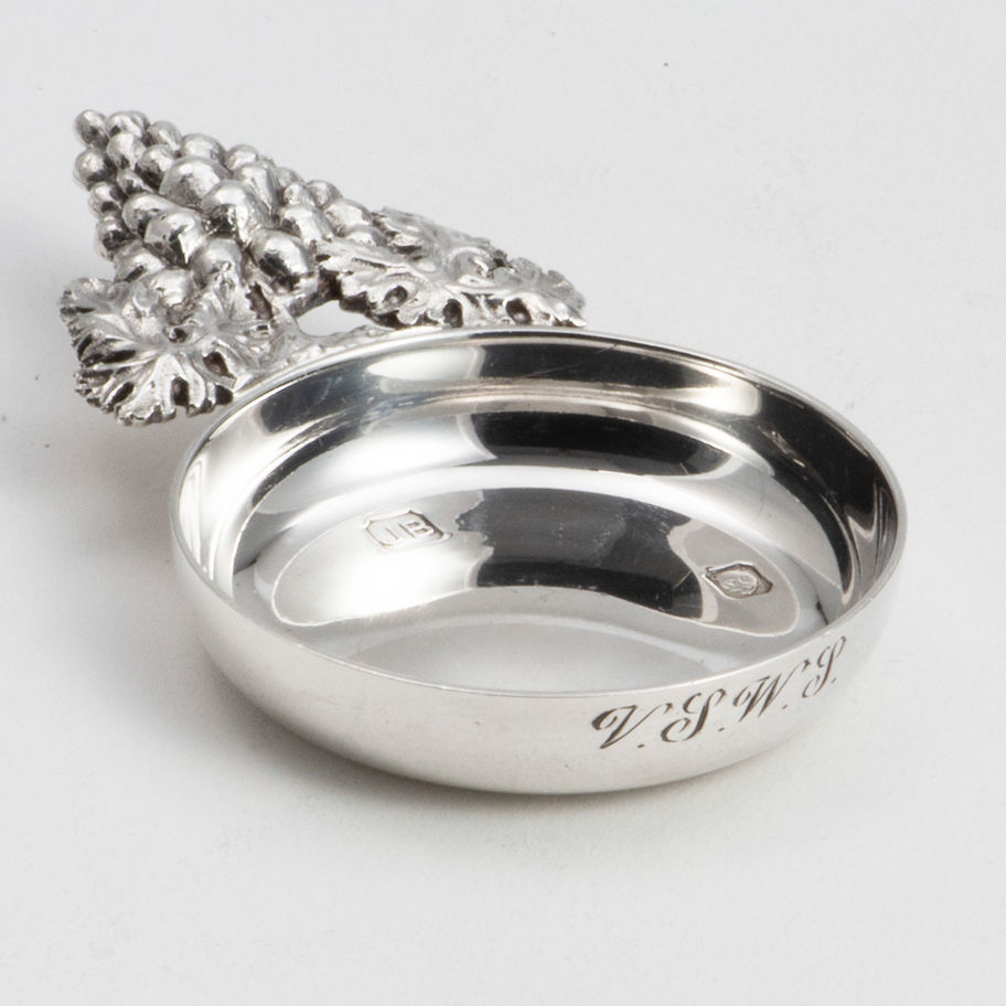 Jocelyn Burton. \nA miniature silver Wine Taster with cast vine and grape handle, London 1984. The front of the bowl engraved with script initials 'V.S. W.S.' Condition: \n