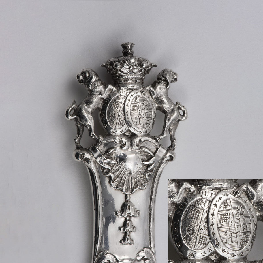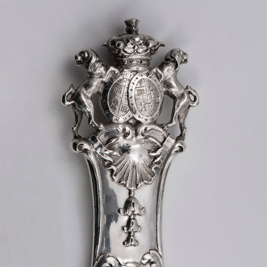 Robert Grosvenor, 1st Marquess of Westminster [1767-1845]. \nA large and exceptional Victorian Soup Ladle with shell bowl, London 1841, by Mortimer and Hunt, successors to Storr and Mortimer. The handle terminal is formed as the accolé arms of the 1st Marquess with supporters and coronet. In March 1841, the Marquess was made a Knight of the Garter and the arms incorporate the Garter motto. The ladle formed part of a very large order from Mortimer and Hunt in that year including plates, serving dishes, with dish covers, tureens, entrée dishes and warmers, all of the pieces ornamented with elements of the Marquess's arms. This large order supplemented earlier acquisitions of plate after he succeeded his father as Earl of Westminster in 1802. After that date he began rebuilding Eaton Hall then, in 1805, purchased Grosvenor House. He was created a Marquess in 1831. \nA part of the Marquess's plate was sold by Sotheby's London on the 2nd July 1959: 'The Property of the Most Noble Hugh Richard Arthur, Duke of Westminster, sold by order of the Executors.' Condition: \n