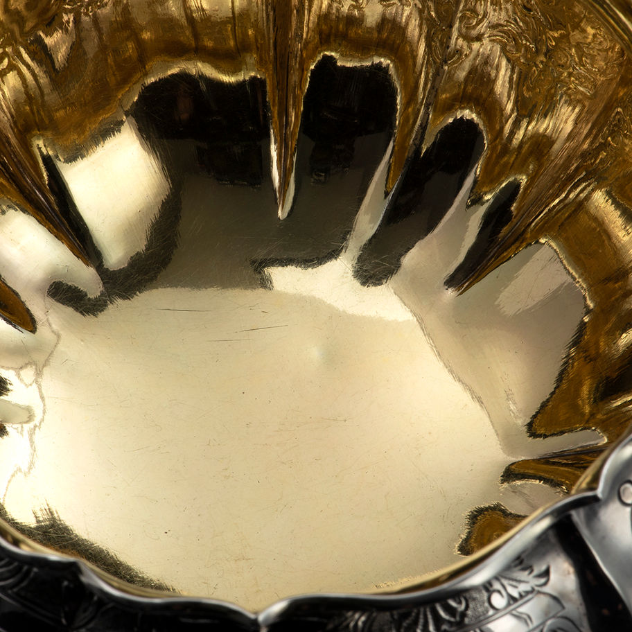 A large Victorian Sugar Bowl with gilt interior, London 1859, marked by William Moulson for Lambert & Rawlings. The fluted melon body is flat-chased with panels in imitation of the 1730's. The handles are formed as cast asymmetrical scrolls. Underneath the bowl is engraved 'Mary Ann Wilson from her Uncle John Simpson, Feby. 1860.' The body is engraved on one side with a family crest. Condition: \n