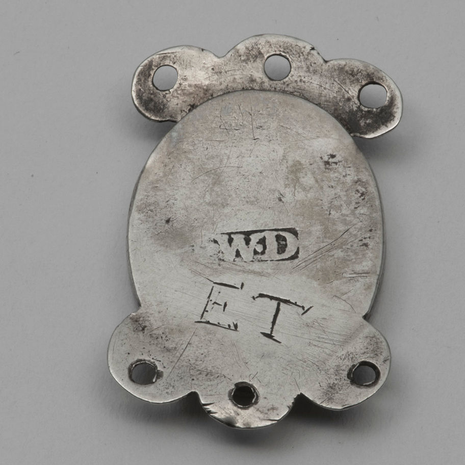 A late 17th century silver Clasp, the front engraved with a seeded rose within a border of wrigglework, the reverse struck with a maker's mark only 'WW', and engraved contemporary initials 'ET.' Probably English circa 1700. Condition: \n