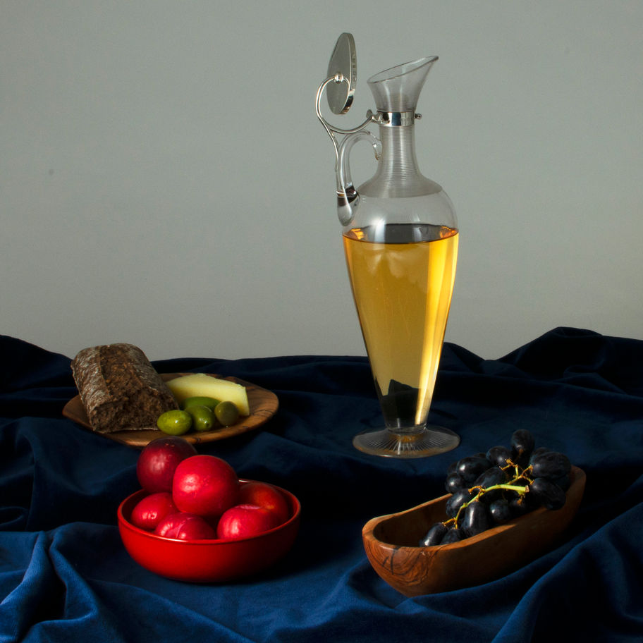 A late Victorian silver mounted glass Claret wine Jug, Birmingham 1895 by Norton and White. The slender body, with narrow neck, is clearly inspired by classical forms and is ornamented with horizontal ridged decoration on the neck and upper shoulder of the glass. The interior of the lid is inset with cork. Condition: \n