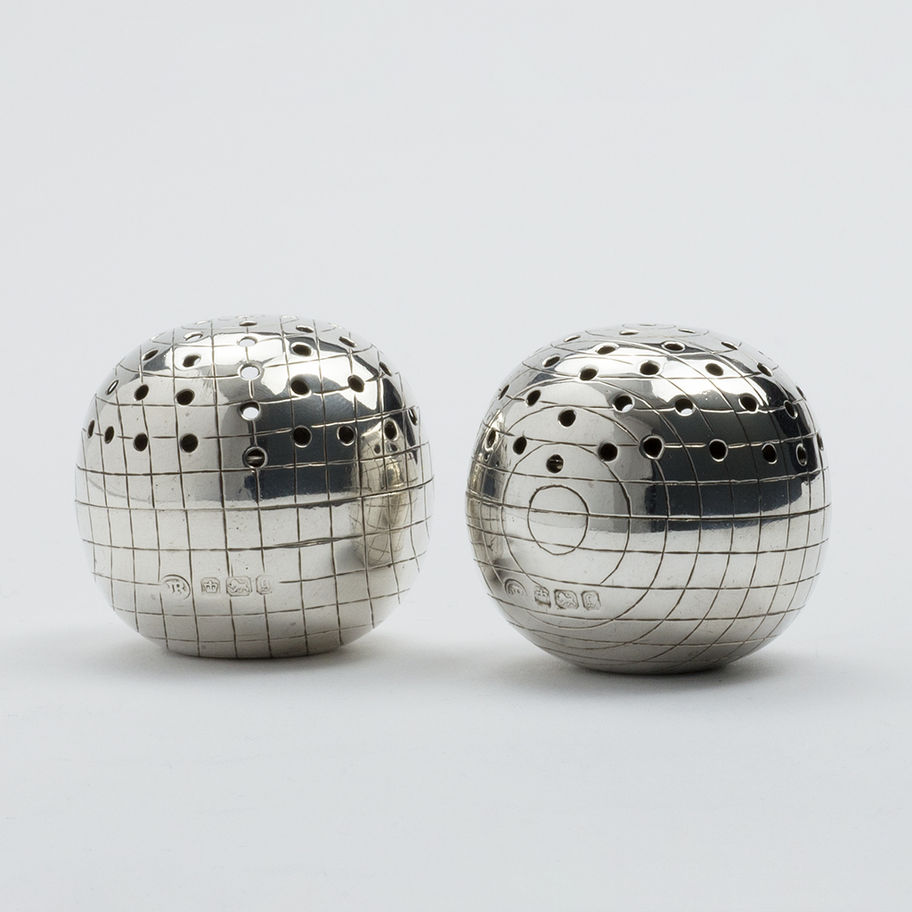 A pair of silver Pepper pots formed as croquet balls, Sheffield 1899, by John Round. Condition: \n