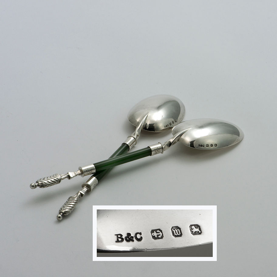 Frank Hyams of Dunedin, New Zealand. \nA pair of silver Spoons with jadeite stems and the terminals as stylised Maoris, marked in Birmingham 1896 by James Bradley and Herman Cohn of Bradley and Cohn, 'Export Merchants' of Basinghall Street, London. \nFor Frank Hyams, 1887-circa 1906, see 'Gold & Silversmithing in Nineteenth & Twentieth Century New Zealand', by Winsome Shepherd. For the period after 1902, when Hyams returned to England and established premises at 128 New Bond Street, see 'The Directory of Gold & Silversmiths, Jewellers & Allied Traders 1838-1914', by John Culme. Condition: \n