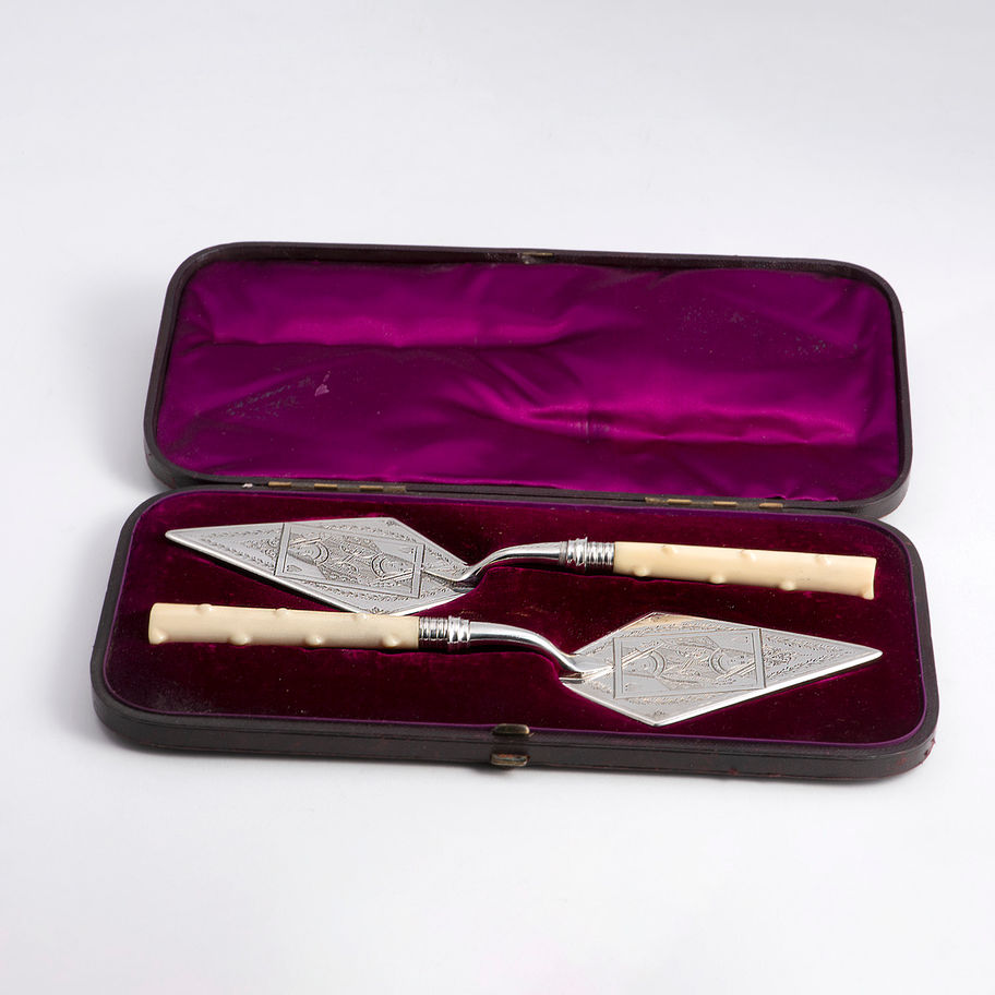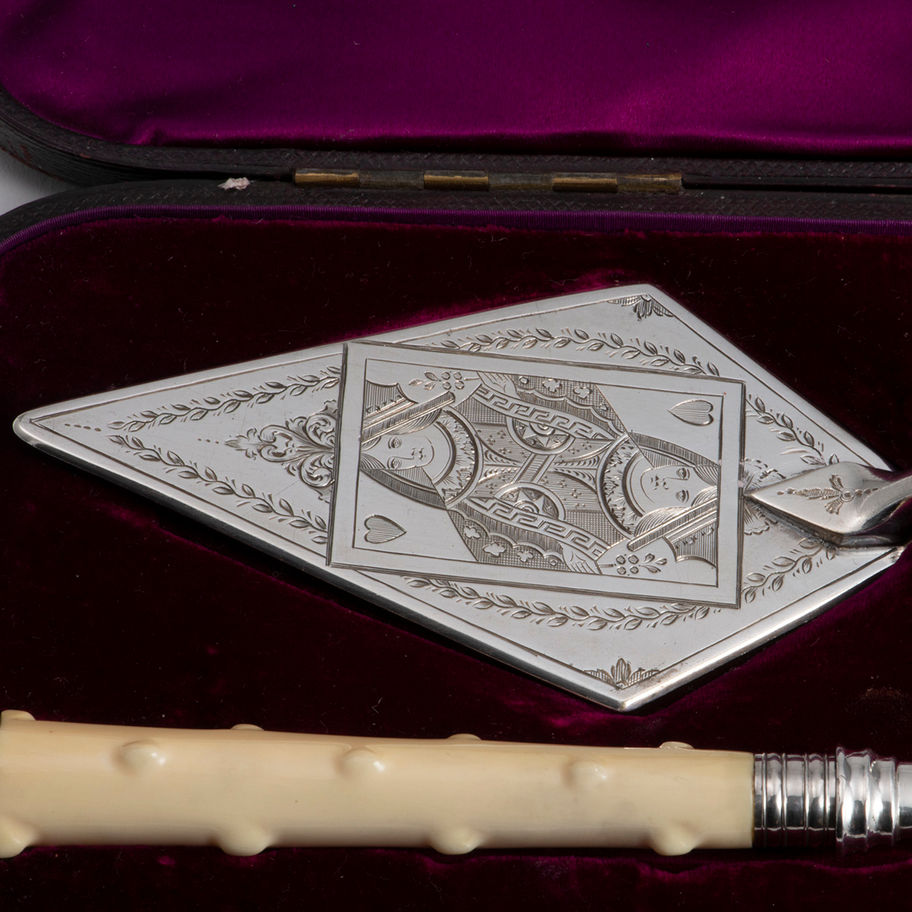 A pair of Victorian electro-plated Tart Servers, circa 1880, by Atkin Brothers of Sheffield. Cased. One server ornamented with bright-cut engraving on the handle, both engraved on the blade with an image of the Queen of Hearts. Condition: \n