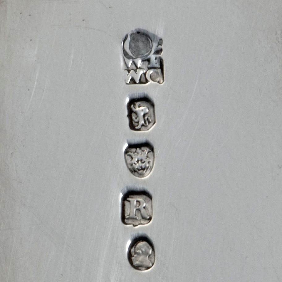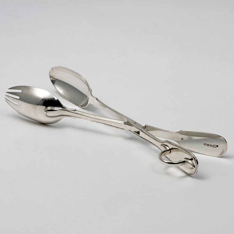 A pair of George III fiddle thread pattern scissor-type Serving Tongs, London 1812, by Eley, Fearn and Chawner. Engraved with a crest and coronet for the Earl of Poulett [4th Earl Poulett, 1756-1819]. \n \nScissor type Salad servers of this form are extremely unusual in English silver at this date. Seymour Rabinovitch , 'Antique Silver Servers for the Dining Table', illustrates a Strasbourg silver example and a bone, French prisoner of war, example. Condition: \n