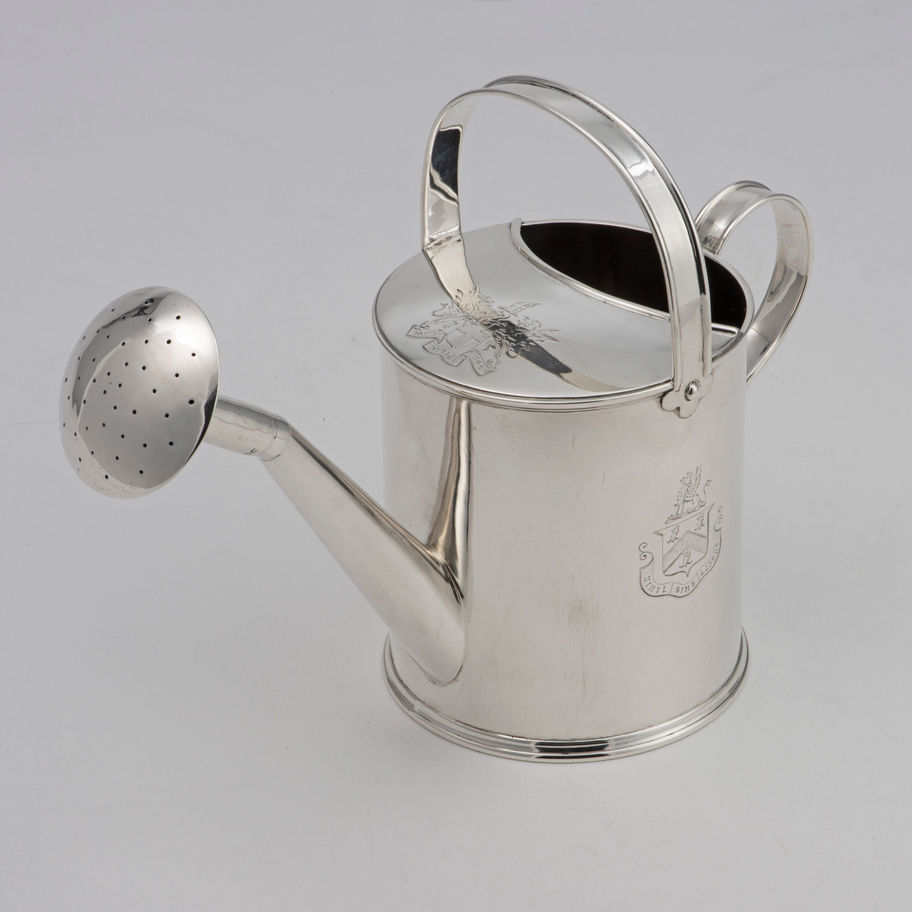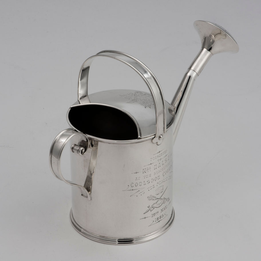 A Victorian silver commemorative Watering Can, London 1882, by David and George Edward for Edwards of London and Glasgow. The top of the can is engraved with the coat-of-arms of the City of London, and on one side the can with a coat-of-arms apparently for Halse [a variant of the documented arms of the Halse family], and on the other with an inscription: 'Presented to Mrs. Halse at the Dedication of Coulsdon Commons to the Public Use 19th May 1883.' The inscription incorporates a cap of office above a crossed sceptre and sword with a blank scroll. The sprinkler on the end of the can is removeable. \nThe event commemorated was extensively reported in the newspapers of the period and resulted in the preservation of an extensive area of common land for the public after the Corporation of London had bought the commons for £7,000. \nThe 'Morning Post' of May 21st 1883 carried the following report: \n'Dedication of Coulsdon-Commons. The Lord Mayor and the Sheriffs of London and Middlesex, as well as a large number of the members of the Corporation, left London-bridge Station on Saturday by special train for Caterham Junction, en route to the Coulsdon commons. The company, on arriving at Caterham Station, which was decorated with flags, proceeded in carriages by way of Caterham-valley, passing Riddlesdown, where the City flag was hoisted, to Kenley Bridge. At the bridge a guard of honour of the Surrey Volunteers was in attendance, accompanied by the band of the regiment, which preceded the company to Kenley-common, where memorial trees were planted. On arriving at Couldson commons the City Solicitor handed the deed of conveyance of the property recently purchased by the Corporation to the Lord Mayor. After and address read to the Lord Mayor by the Rev. D.D. Stewart, rector of Coulsdon, had been responded to, Mr. Shaw Lefevre, M.P. (the Chief Commissioner of Works), at the request of the Lord Mayor, declared the commons opened to the public for ever, and said – In compliance with the request of the Lord Mayor of London, I have the honour and privilege to announce to you that the corporation of the city of London have acquired by purchase all the rights of the lords of the manor in and over the Coulsdon-commons, consisting of four separate commons – namely, that of Fairdean, consisting of 121 acres; Riddlesdown, of 78 acres: Kenley common of 70 acres; and Coulssdon-commons, of 77 acres – in all amounting to 340 acres. They acquired these commons with the sole object of securing them against all possibility of enclosure for all time to come, with a view also to their being enjoyed by the public as a natural park and recreation ground, and with this object the commons will be placed under proper regulations for the maintenance of order and their preservation in all their natural beauty. On behalf, then, of the Corporation of London, I now declare these commons to be henceforwards dedicated to the use and enjoyment of the public. I feel certain that all here present, and, indeed, the whole of the public of London will join in thanking the Corporation of London for their benificent, public spirited, and wide-seeing action [Applause].' \n'The right hon. gentleman then planted a memorial tree, as also did the Lady Mayoress and others. \nThe civic part, on leaving Coulsdon common, drove in view of Farthing Downs, where a second flag was hoisted. They then returned through a most picturesque country to Caterham Junction, and the special train conveyed them to the Crystal Palace, where dinner was served in one of the small halls. Mr. Halse, chairman of the Coal, Corn and Finance Committee, presided at the dinner.’ [Details of some of the speeches and toasts given in the article]. Another report in 'The Standard' of the same day notes that those who planted memorial trees on Kenley Common comprised 'the Lady Mayoress, Mr. Shaw Lefevre, Mrs. Halse, and Mrs. Henry Hicks.’ Richard Clarence Halse was, as the article stated, the Chairman of the Coal, Corn and Finance Committee of the Corporation of London and presided at the dinner in the Crystal Palace. He died in 1897. \n \nThe first image shows the can superimposed on a view of Kenley Common where the trees were planted. For this and other views see https://www.croydonist.co.uk/kenley-common/ Condition: \n