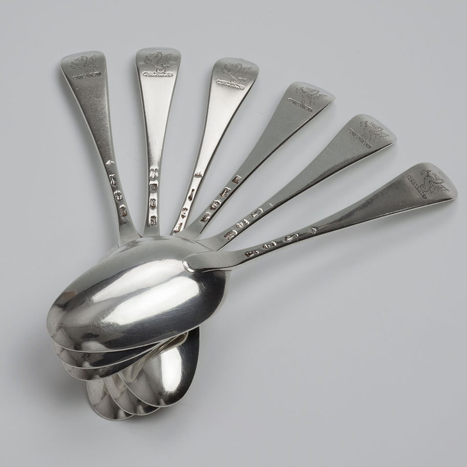 A set of six George II silver Hanoverian pattern Tablespoons, London 1750, by Ebenezer Coker. Engraved with a crest. Condition: \n
