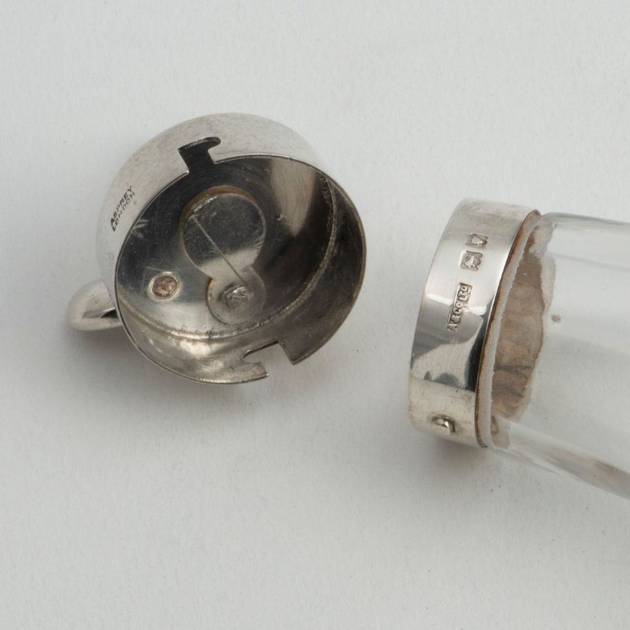 A silver and glass novelty Powder Flask by Asprey and Company.