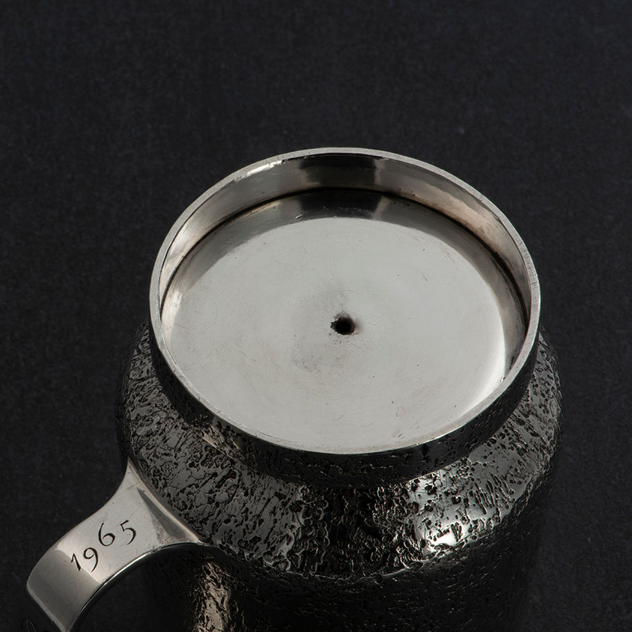 Peter Guy Watson. \nA 20th century silver Mug, the body textured like rough cast concrete, the handle inset with a small square stone, London 1965. The interior of the mug is gilt and the exterior surface of the handle is engraved 'LR from LR 1965', probably as a gift from Leslie Runciman, 2nd Viscount Runciman, to his grand-daughter, Lisa Runciman, born 18th of August 1965. \n \nGuy Watson studied at the Royal Academy of Arts. He is better known as a maker of Jewellery, often with texturing in a 'Brutalist' manner, working in Harrogate. Condition: \n