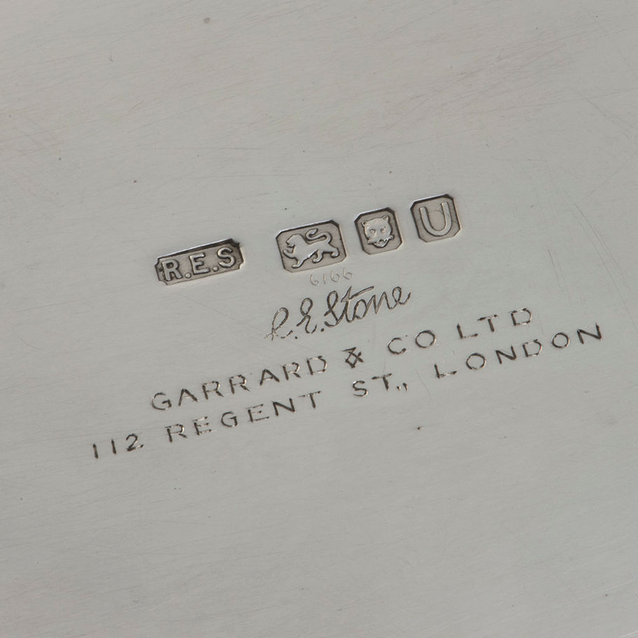 R.E. Stone. \nA Strawberry Set comrpising a Sugar Caster and a Cream Jug on a Stand, London 1955. Engraved underneath each piece with the retailer's name 'Garrard and Co. Ltd., London.' \n \n Condition: \n