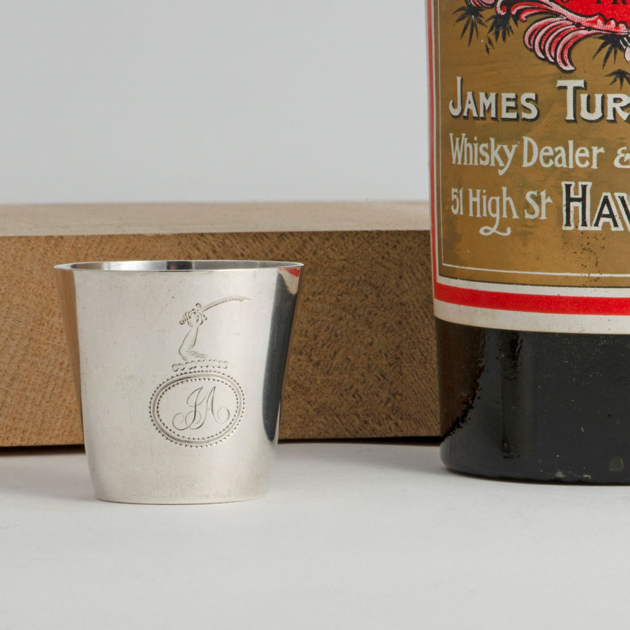 A small silver Tot Beaker, circa 1800, struck with a script maker's mark only 'JR', unidentified but probably colonial. The side of the beaker engraved with a family crest above a bright-cut oval cartouche with script initials 'JA' within. Condition: \n