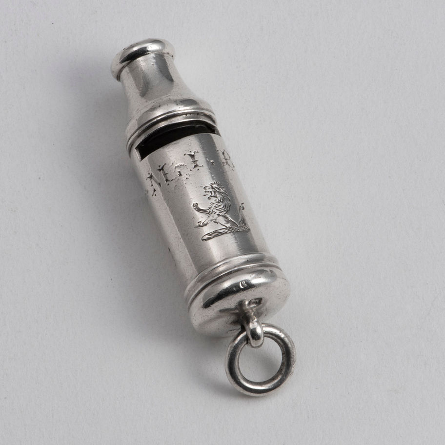 A Victorian silver Whistle, London 1871, William Summers, the body engraved with a family crest below the initials 'M.I.B.' Condition: \n