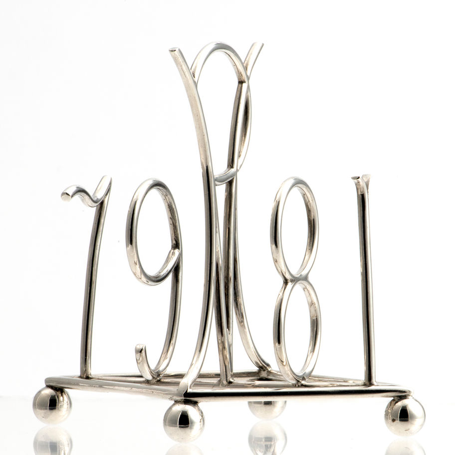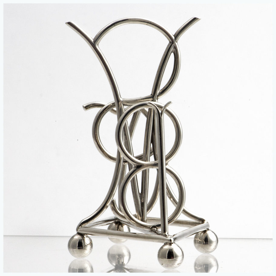 Hukin and Heath. \nA late Victorian silver Toastrack, formed of wirework and supported on four spherical feet, Birmingham 1896. Above a lozenge-shaped base, the supports form the date '1897' with 'VR' at the centre. The underside is struck with a pattern number '12643' and a registered design number '294247.' Condition: \n