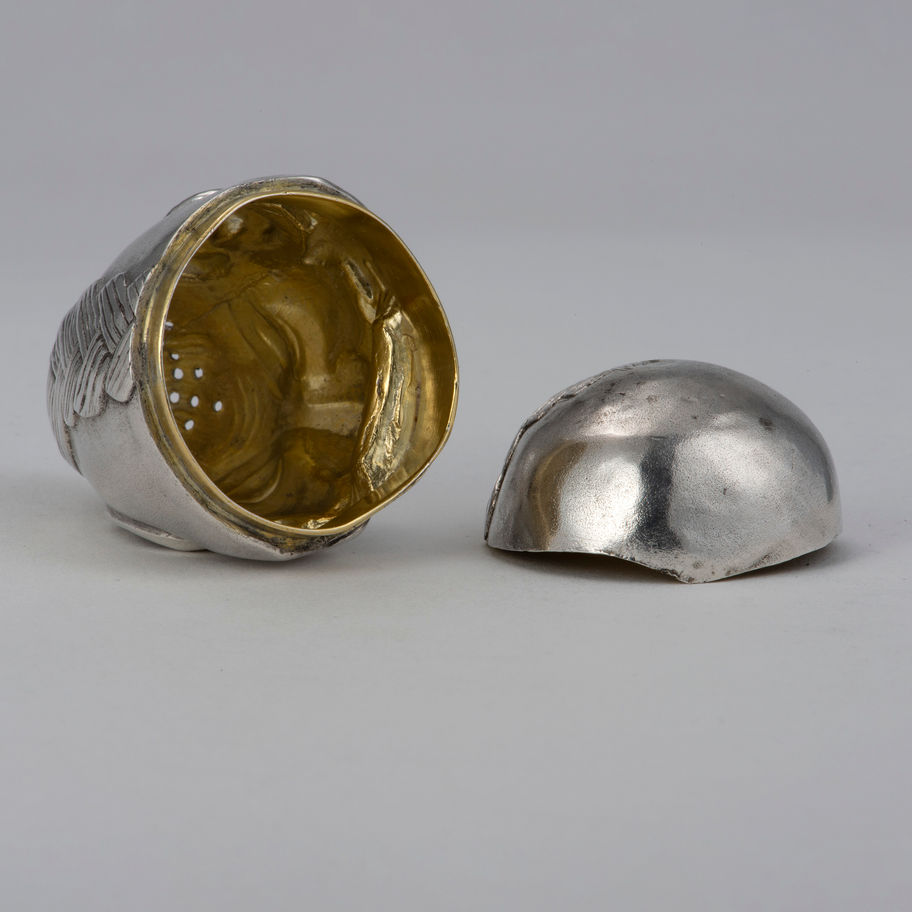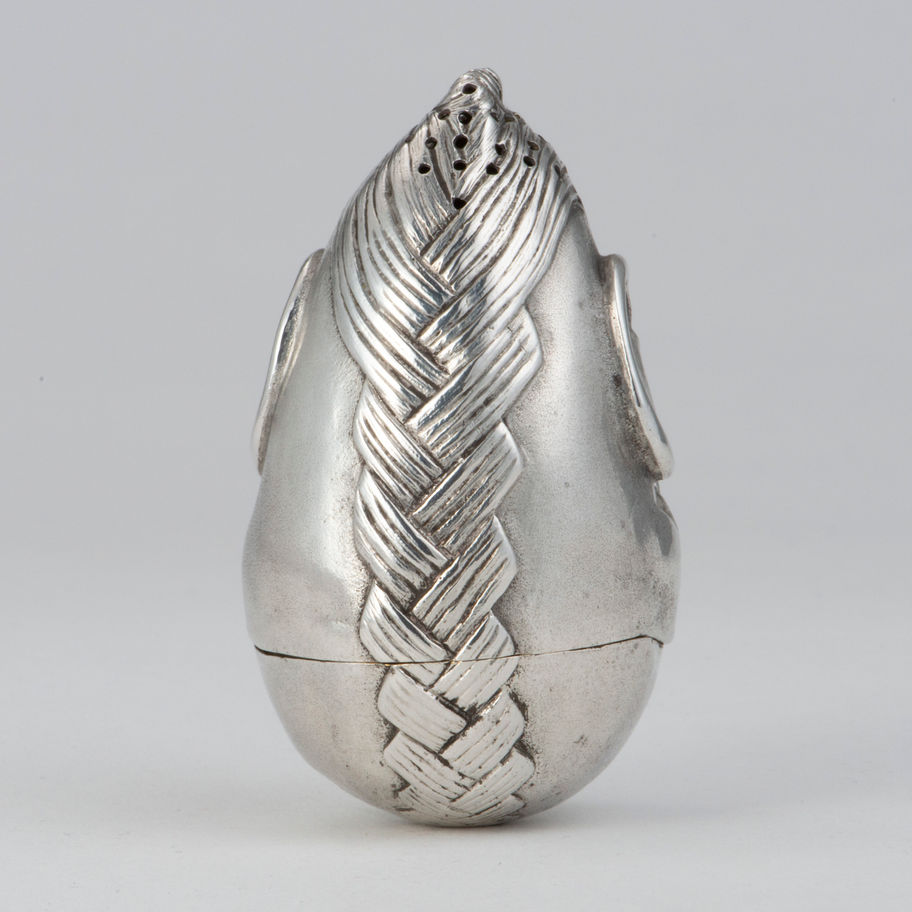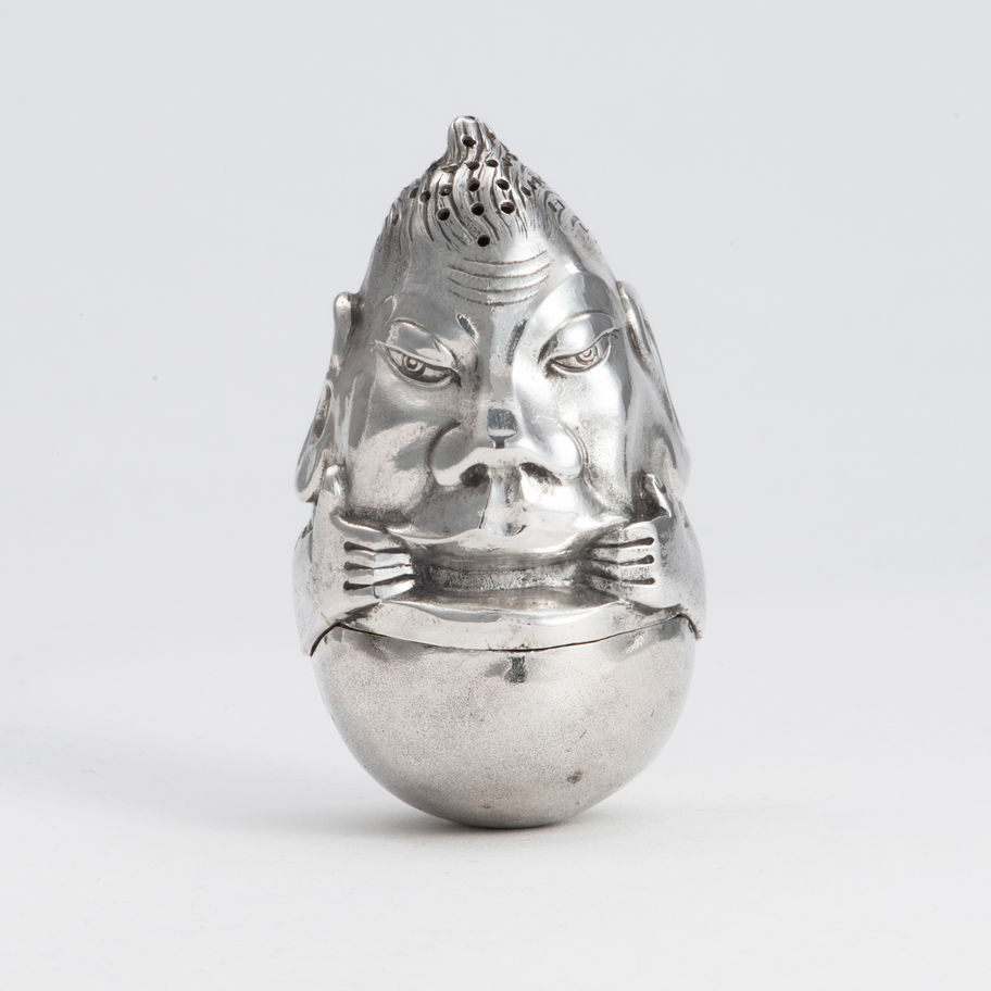 A Victorian silver novelty Pepper Pot with weighted rocking base, London 1875, by Henry William Dee, in the form of an oriental 'Oni-like' head. \nThe Dee brothers, working in silver and bronze, like the Martin brothers a few decades later, who worked in pottery, made a number of articles based around caricature or gargoyle-like faces. Condition: \n
