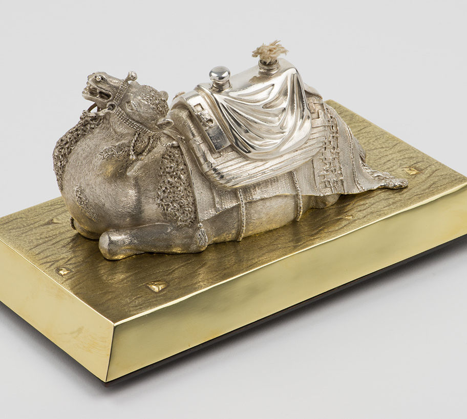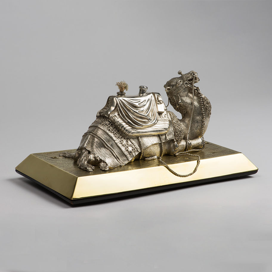 A Victorian novelty silver Table Lighter, formed as well-modelled seated Camel with saddle and harness, London 1876, by Barnard and Sons [Edward, John, Walter and John]: the silver camel is set on a base metal textured base. The wick unscrews to enable the body to be filled with spirit and the dipper is formed as the saddle pommel. \n \nThe camel is fully hallmarked on the body of the camel, the wick is part-marked and the dipper unmarked. Condition: \n