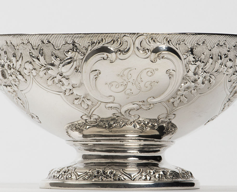A Victorian Scottish silver chased Bowl, Edinburgh 1846, by James McKay. The interior of the bowl is silver-gilt and the exterior is engraved with contemporary script initials 'JC'. Condition: \n