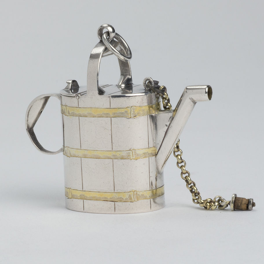 A Victorian silver novelty Scent Bottle in the form of a hot-water can, by Henry William Dee, London 1872. The base engraved with a registered design lozenge and the retailer's name 'P. & F. Schafer, 27 Piccadilly.' Condition: \n