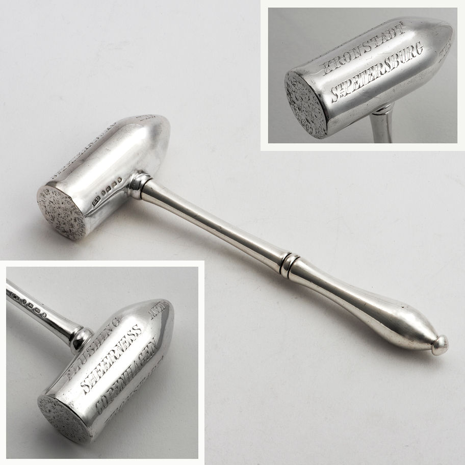 A Victorian silver Gavel, Birmingham 1884, by George Unite, the 'hammer' end formed as a naval artillery shell and engraved with: 'Flushing';'Sheerness'; 'Copenhagen'; 'Kronstadt'; 'St. Petersburg'; and, on the cone, ‘The Skaw’. The flate end of the shell, now battered from use, is engraved: ‘Memento of Escort Command.’