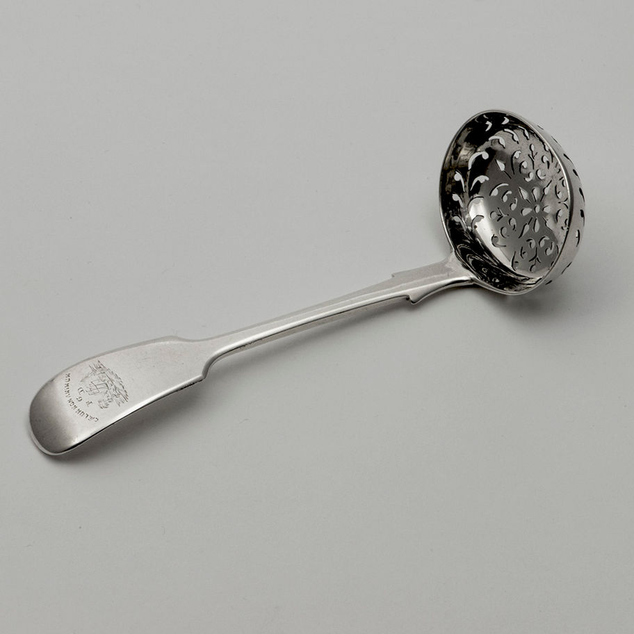 A Victorian silver Sugar Sifting Spoon with an unusual crest.