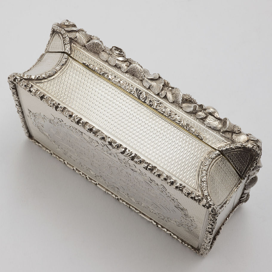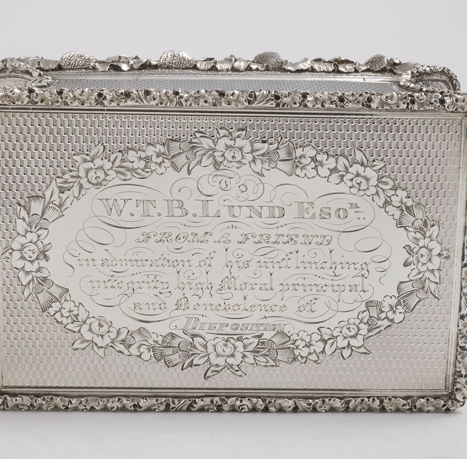 A Victorian Table Snuffbox, London 1858, George Edwards, presented to William Thomas Bullen Lund of Haverstock Lodge, Hampstead [1810-1888]. Lund was a large property owner in the St. John's Park area and a leading member of the Roman Catholic Church. He married in 1837 Mary Magdalen Gillow, daughter of the furniture maker. Condition: \n