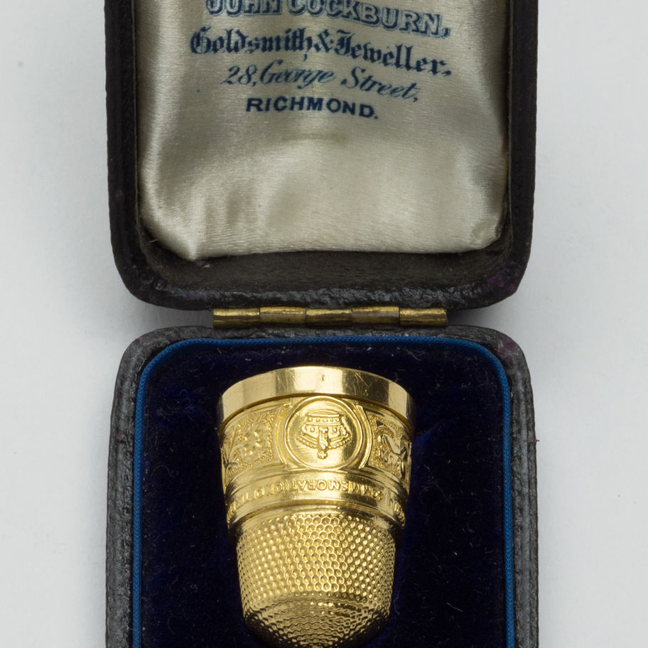 An unmarked high carat gold Thimble for Queen Victoria's Jubilee, struck with a registered design number 295282 and with 'H&I' incuse. In an original retailer's case for John Cockburn of Richmond. This design was registered by Hamilton and Inches. Silver versions were made by Deakin and Francis [ My thanks to Dr. William Isbister for this information]. Condition: \n