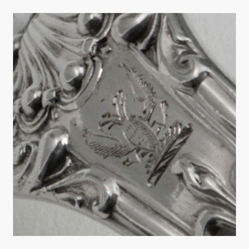 A William IV silver kings pattern Condiment Ladle, parcel-gilt, London 1834, the maker probably William Traies. The front engraved with a family crest. Condition: \n