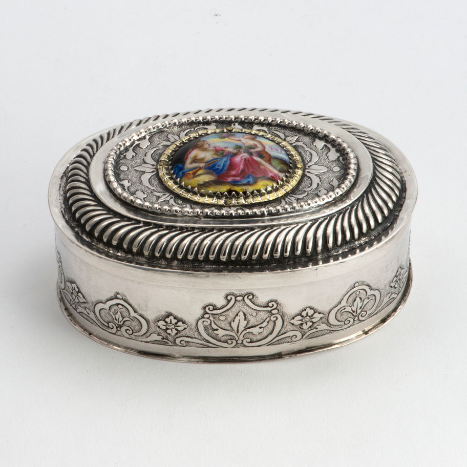 An unusual early 18th century oval silver Box, European, probably Basel, Switzerland, circa 1710, the pull-off lid inset with an enamel panel painted with a classical scene, within a silver-gilt frame. Condition: \n
