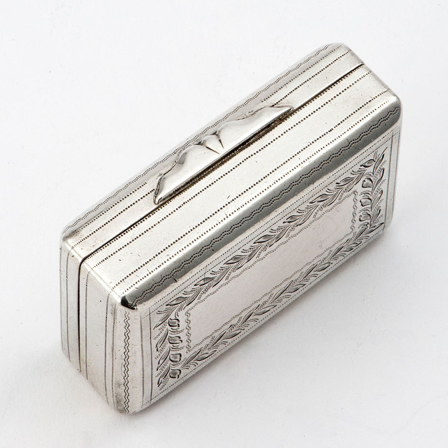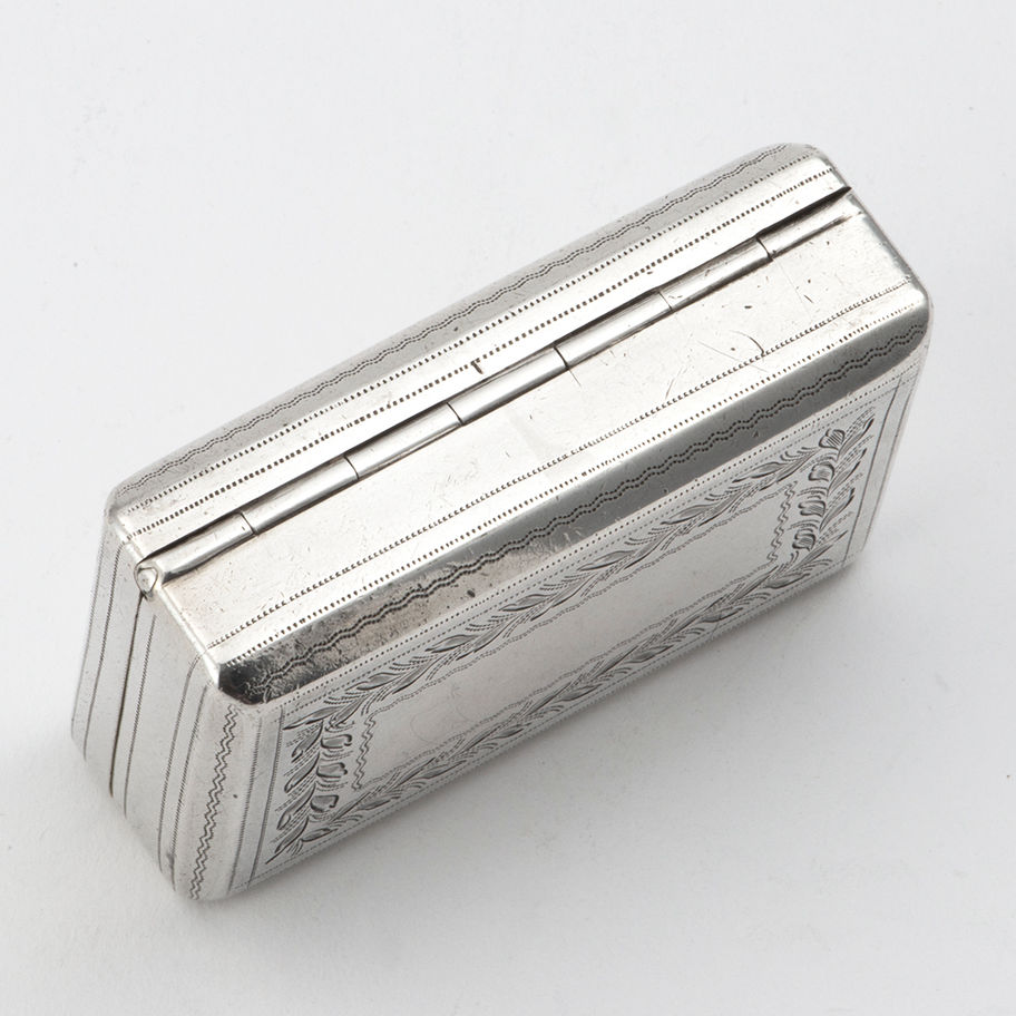 A Cape silver Snuffbox, the exterior decorated in the manner of a Birmingham made box of circa 1820, by Lodewyck Beck, circa 1850. \n \n[For an illustration of Beck's marks, see Stehan Welz, 'Cape Silver and Silversmiths', p. 145. The marks on this box combine elements of the marks shown in illus. 6 and 7]. Condition: \n