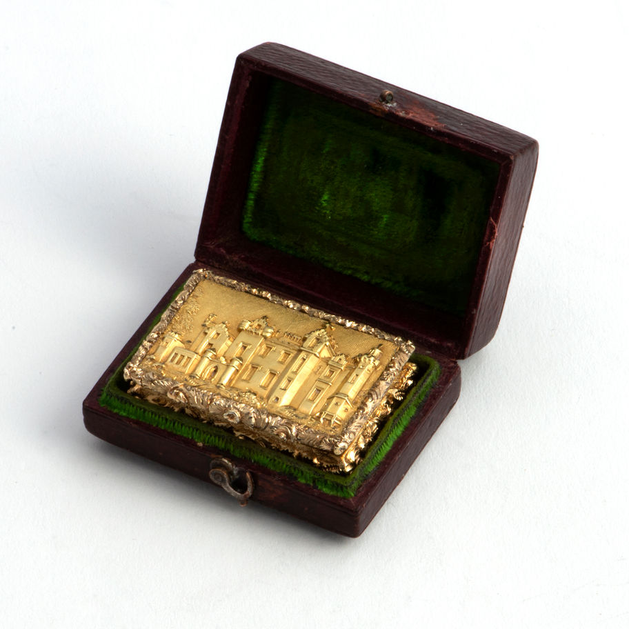 A silver-gilt scene top Vinaigrette, 1836, by Nathaniel Mills, Birmingham, the lid inset with a view of Abbotsford. The vinaigrette retains its original morocco case. \n \nFor the history of 'Castle top' boxes, see the Research tab of this website. Condition: \n