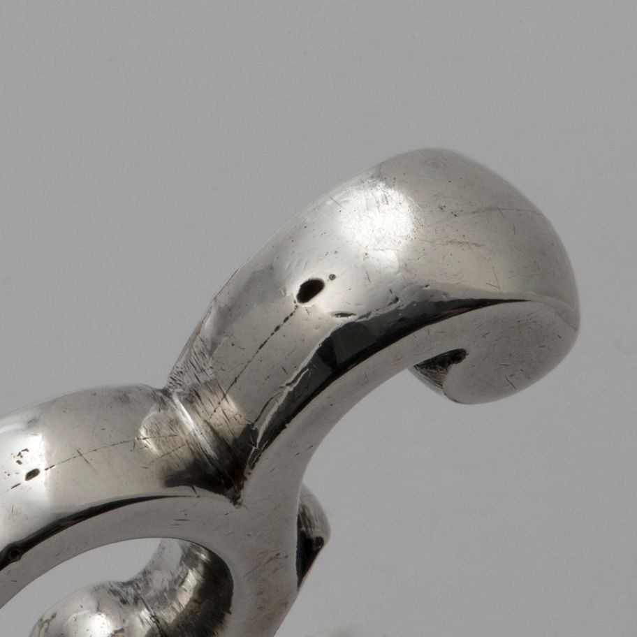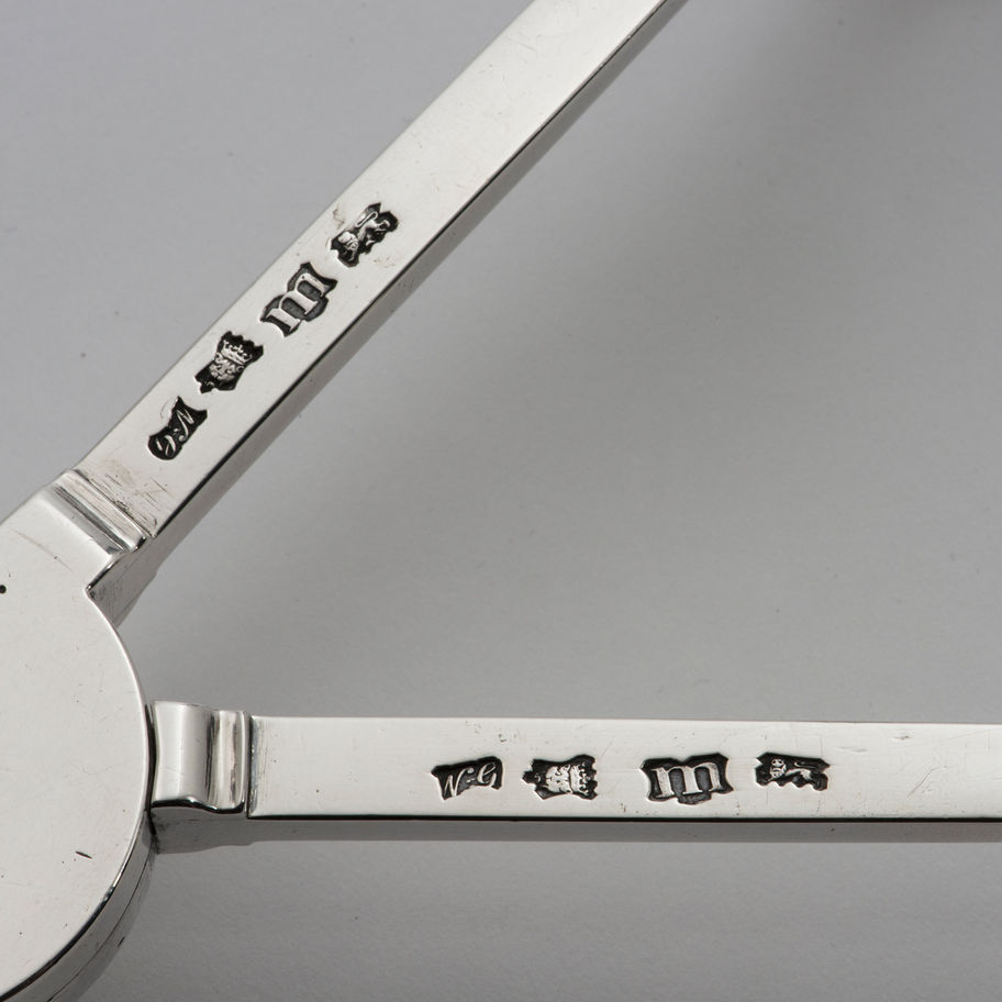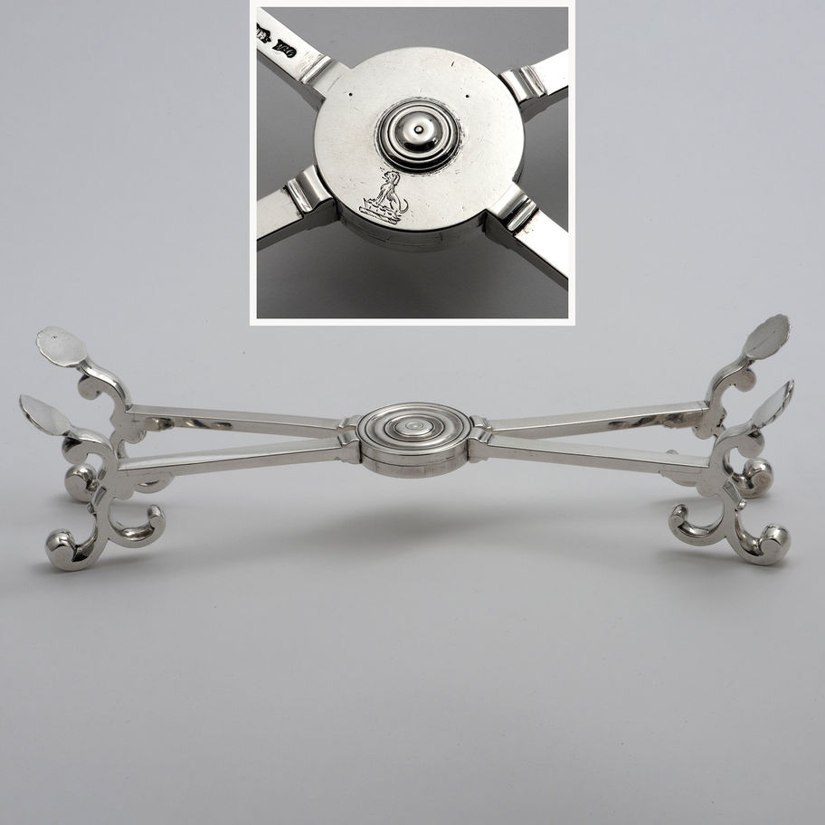 A George II silver Dish Cross, London 1747, by William Grundy. Engraved with an original owner's crest at the centre. \nThis heavy gauge dish cross, formerly in the stock of Malcolm Stearns, is the earliest example of this type so far noted. \n \nDish crosses [used for keeping dishes warm and preventing burn marks on wooden surfaces]: \nType 1) \nThe arms of which are four parallel and layered lengths of shaped thick guage sheet with fixed cast ends, which serve as feet below and dish rests above. Thus paired into two members, the narrower within the wider, the arms have a circular disc at the centre and rotate around a brass pin screwed vertically through them, with a short baluster strengthening tube between the upper and lower layers of the narrower pair of arms. Four simple capstan shaped rests are rivetted to the upper surface of each arm to provide additional support for dishes. This form does not normally have a burner. \n \nType 2) \nA mechanised cross with three adjustable ratcheted arms emanating from a central burner. The rectangular arms, with cast scrolled terminals, are slotted through the central burner and, as one arm is adjusted inwards or outwards, the others move in unison. There is thus no rotational movement of the cross. Dishes are supported entirely upon the upper parts of the scrolled ends of the arms. \n \nType 3) \nThe four arms of the cross are rectangular in section and are fixed in pairs to central discs or, if there is a burner, rings around the neck of the burner. The arms rotate in the same manner as type (1). From the 1750’s, at the outer ends, the arms slot through apertures in cast scrolled terminals, which can be moved along the length of the arms to accommodate a variety of dish sizes. A variety of paterae, rosettes or balusters applied to the ends of the arms retain the sliding terminals. As with type (2), the only supports for dishes are the upper parts of the terminals. \n \nThe earliest silver dish crosses are Irish dating from the 1730's. Only three are known, all from Dublin. They are of type (1) with cast ends formed as flat-backed balusters. One, now in the National Museum of Ireland, is marked with the Dublin date letter for 1730 but has no maker’s mark. Another is marked by Robert Calderwood circa 1735; and the third, now in a private collection in Texas, is marked by Thomas Walker, also circa 1735. A silvered brass dish cross of this ‘Dublin type’ is known but, whereas the silver examples have plain tapering arms, those of the brass example are shaped. From the 1740's, dish rings become the characteristic form of dish support in Ireland and dish crosses disappear; although Irish newspapers record silvered brass or ‘french plate’ dish crosses. The Munster Journal of September 4th 1766 carries an advertisement by Robert Stevally that he has french plate dish crosses for sale. These were almost certainly imported from London - in April 1737 Thomas Crampton advertised in Faulkner’s Dublin Journal the importation of a vast variety of ‘French plate’ from London and in 1762 Henry Clements advertised French plate and japanned candlesticks from London. \n \nAs might be expected, the sophisticated crosses of type (2) were produced in London. The earliest so far recorded is marked by Paul Crespin and is in the Egremont collection at Petworth. This example has alternative triple or single wick burners. An almost identical cross of 1739, marked by James Shruder, has a locking mechanism so that the arms can be fixed in any given position. The type was produced as late as 1759 - an example by Edward Aldridge and John Stamper - and others have been noted by John Swift in 1754 and Thomas Heming of the same date. \n \nDish crosses of type (3) first appear in London in the 1740's. An example of 1748 by Ayme Videau [like this example of 1747] has no burner but crosses made in 1749 by John Carman [ sold Sotheby’s New York 24/10/2000, lot 321] and Frederick Kandler [in the Royal Collection] have single wick lamps. An example by Coline Allan of Aberdeen, circa 1750, [now in the Aberdeen Museum] is very close in design to the cross by John Carman. The crosses by Carman and Allan have box-shaped sleeves incorporated into the scrolling terminals and it is within these that the arms slide. The example by Kandler and another by William Grundy, London 1757 [Sold Christie’s New York 27/10/1987, lot 286] have simple rectangular apertures in the terminals through which the arms move but they have scrolls springing from the upper and lower sections of the terminals to further grip the arms. Condition: \n