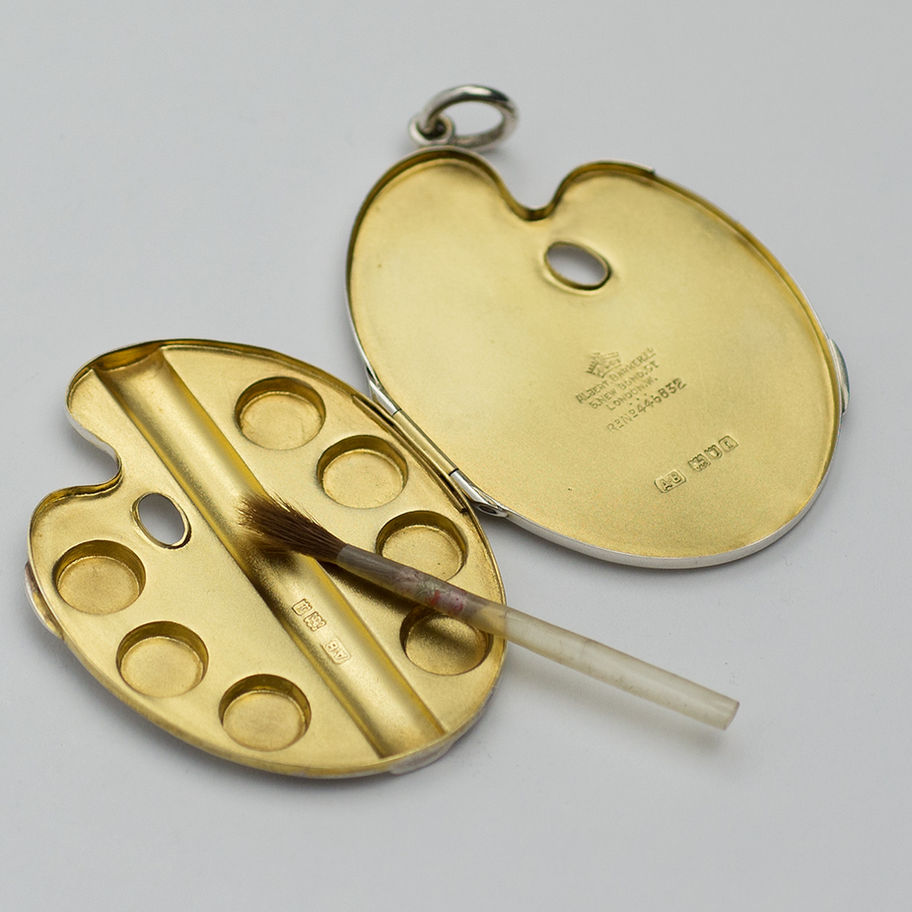 An Edwardian silver Paintbox formed as a miniature Palette, London 1904, Albert Barker. Engraved 'Iris 1905.' Condition: \n