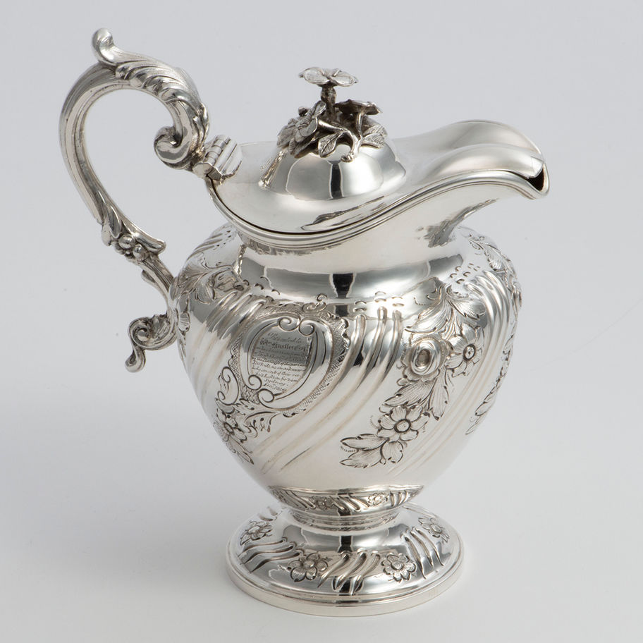 A covered silver Milk Jug, London 1836, by Joseph and John Angel, the interior richly gilt. A cartouche on one side of the jug is engraved with a crest, the other with a presentation inscription: 'Presented to Wm. Hustler Esq. on his Secession from Office of High Sheriff of N S Wales by the Bailiffs of the various Districts, as an acknowledgement of their respect & esteem for him Sydney Decr. 1842.' Condition: \n