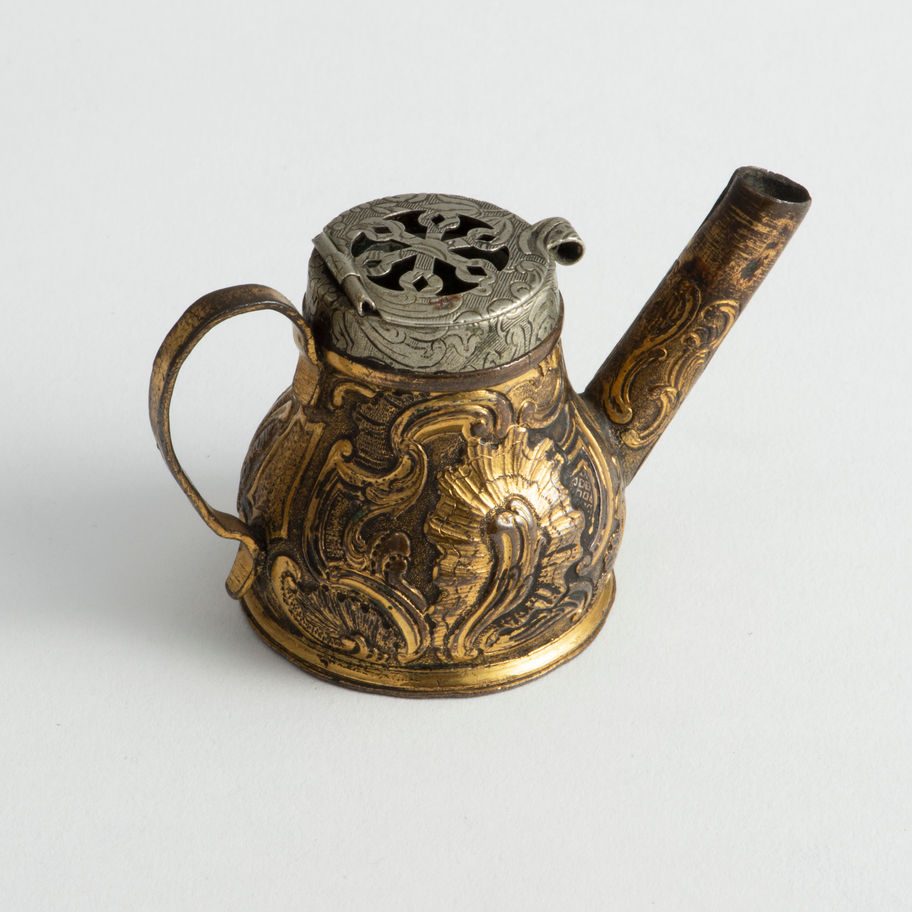 A small gilt brass Pot, with bold scrollwork decoration, circa 1760. The top applied with a nickel alloy mount and hinged pierced lid. Condition: \n