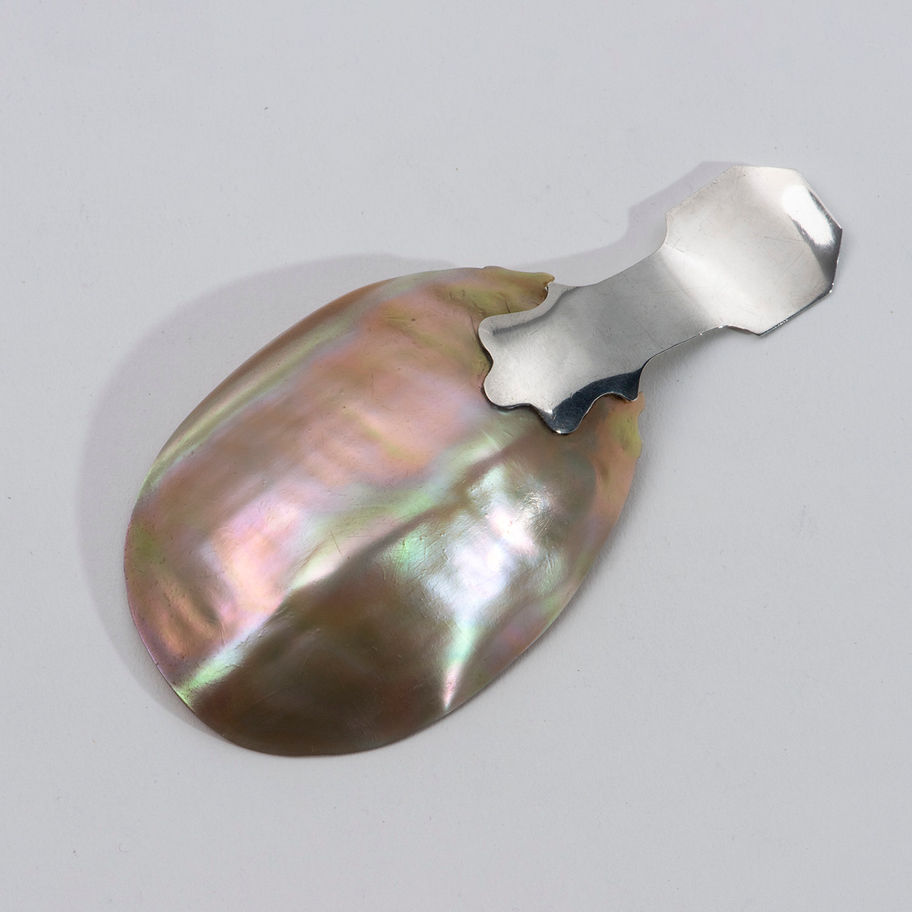 An unmarked George III silver-mounted Abalone Shell Caddy Spoon.