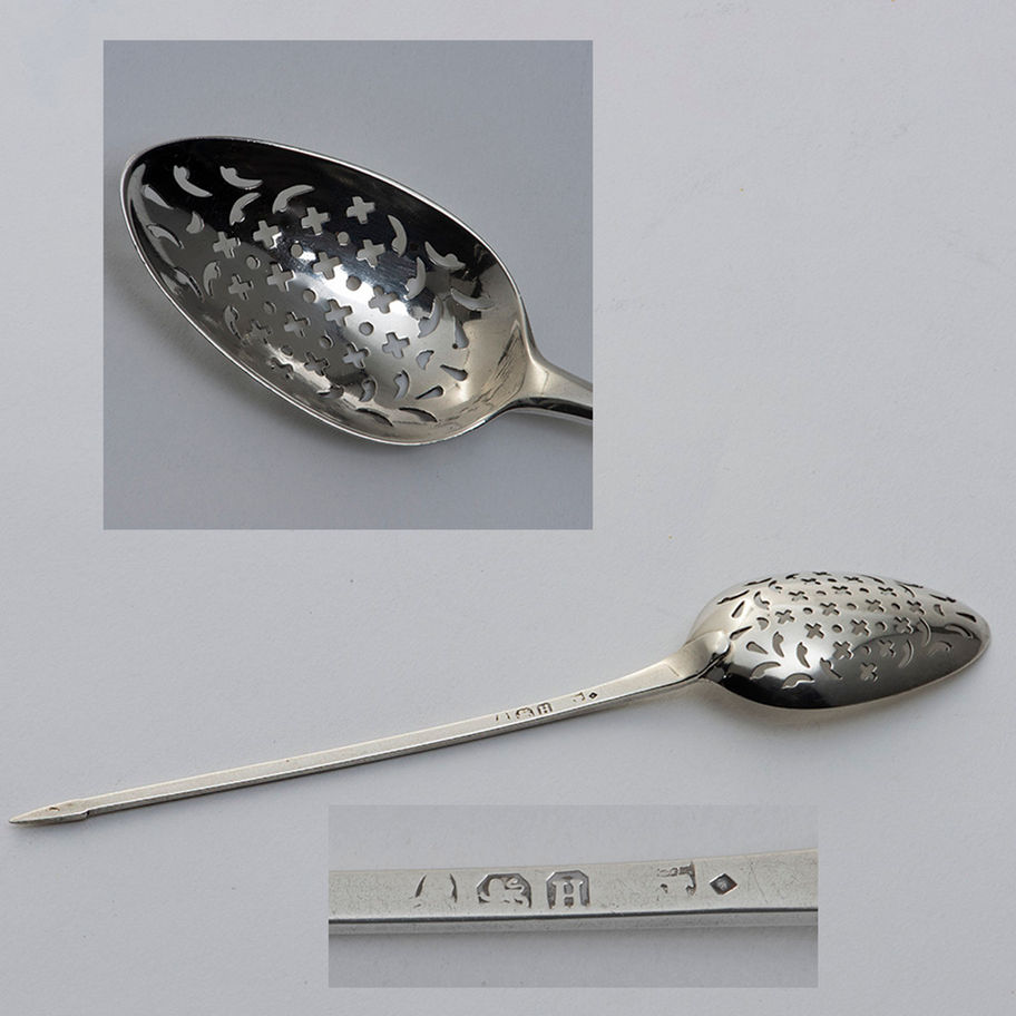 An unusually late George III silver Mote Spoon, London 1804, the maker's mark difficult to read. Condition: \n