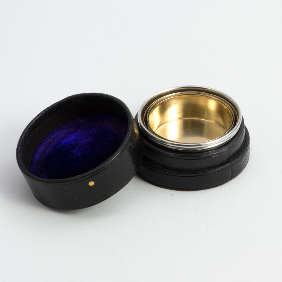 A small Victorian silver collapsible Beaker for use at picnics or whilst travelling, in its original case, the beaker London 1875, by Thomas Johnson, for the retailer Thornhill of 144, New Bond Street. The beaker engine-turned on the exterior with a a circular panel engraved with the owner's initials 'ELA', and the interior of the cup gilt. Condition: \n